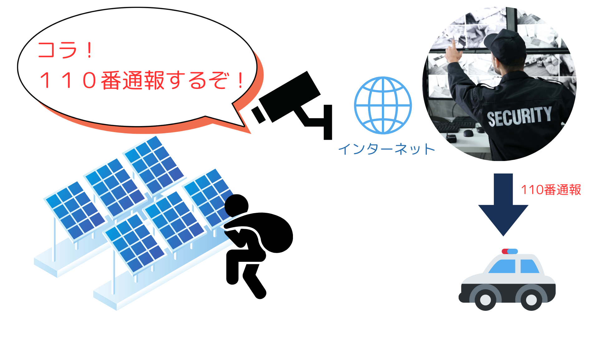 太陽光発電所の銅線盗難対策。遠隔監視&不審者に音声威嚇から110番通報まで対応!月額¥10,000で1カ月から対応(初期費用¥0)代行時給換算48円で代行します!