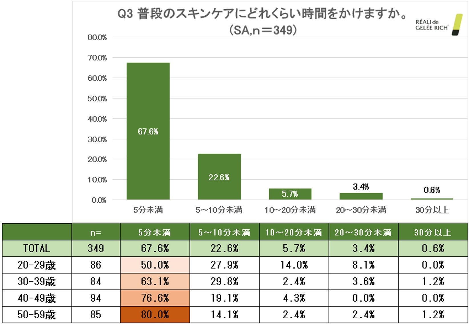 また、スキンケアの時間が5分未満の男性について、20代は50.0%、30代は63.1%、40代は76.6%、50代は80.0%と、年代が上がるにつれてスキンケアに時間をかけない男性が多いことが分かりました。(n=349)