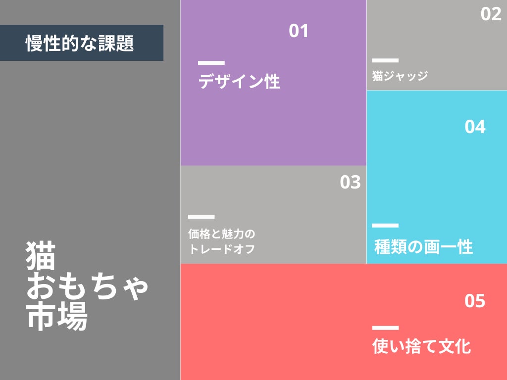 猫のおもちゃは、猫ケージやキャットタワーなどに比べて低価格のラインナップが用意されているため、手軽に購入することができ、飼い主と猫のコミュニケーションに欠かせないアイテムである一方で、猫のおもちゃ市場には下記の課題感があると言えます。