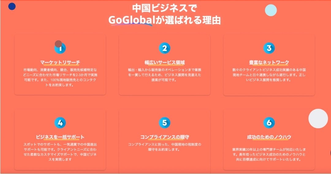 GoGlobalが中国現地に構築している各種ビジネスインフラを駆使して、事前の市場調査から、中国への輸出入代行、販路開拓およびEC販売代行まで一気通貫で“まるごと”サポートする画期的なサービスです。