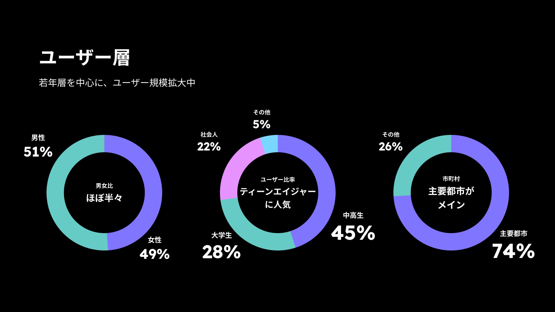 男女比はほぼ半々で、ティーンエイジャーや若い世代を中心に支持が拡大しており、中高生、大学生から社会人まで幅広いユーザーがアクティブに参加しています。