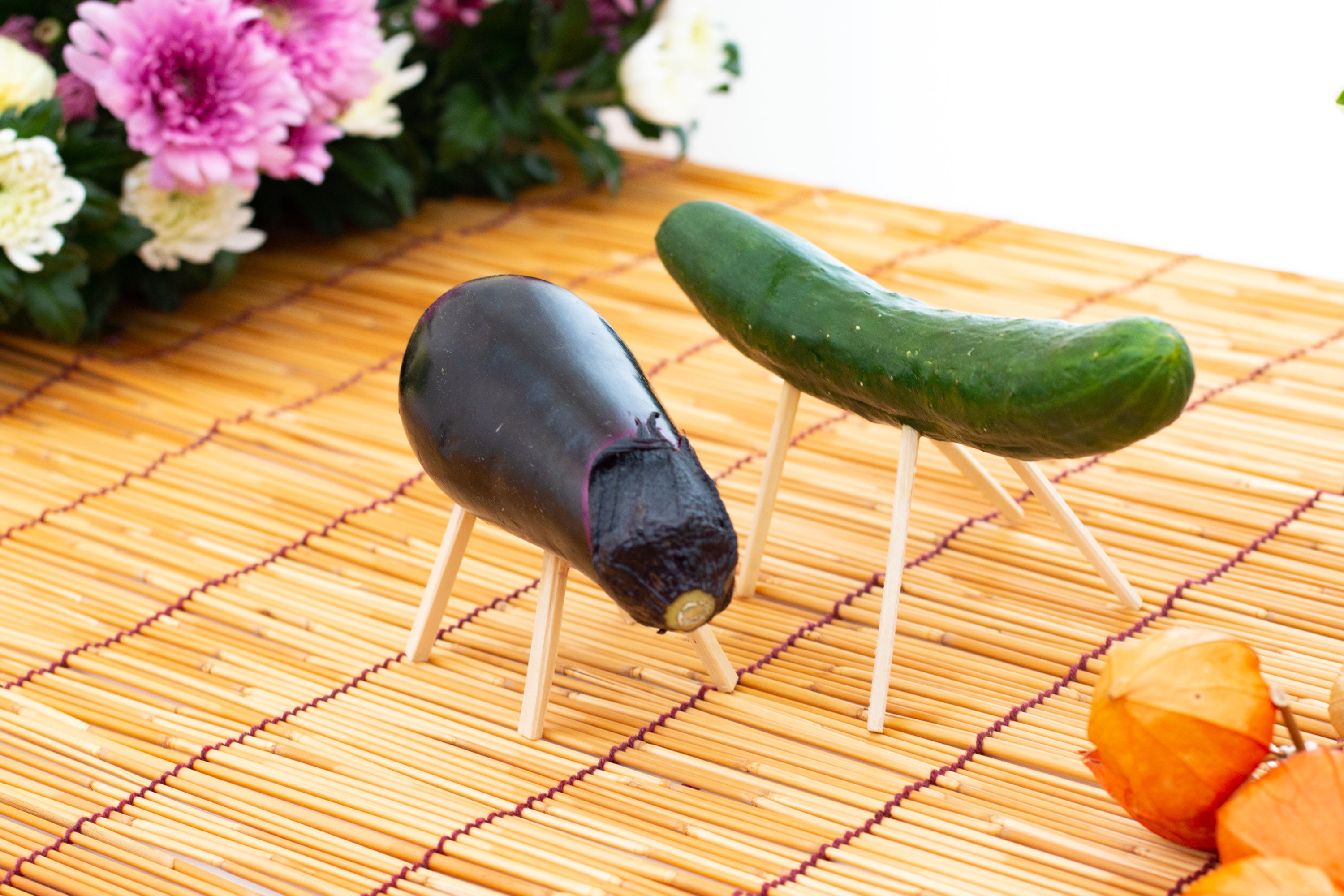 ナスとキュウリに割り箸などを刺して作る「精霊馬・精霊牛」。伝統的なお盆のお供えとして独特な外観と伝統的な意味合いを持つ、夏の風物詩です。「馬は、ご先祖様の霊が帰ってくるときは早く家に帰ってきてもらうため。牛は、帰るときにはお供え物を持って、ゆっくりと景色を楽しみつつ帰ってほしいため。」という願いが込められています。
