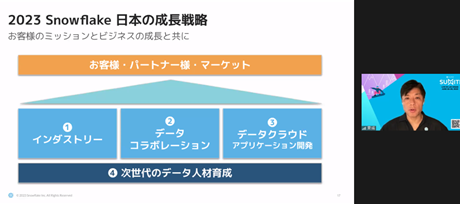 スノーフレイクでは業界ごとに対応したデータクラウドの展開を進めています。発表会では各業界に特化した8営業本部の編成、マーケティングアプローチ、業種コラボレーションの加速の3つの観点から、これまでの取り組みと今後の展望を説明しました。