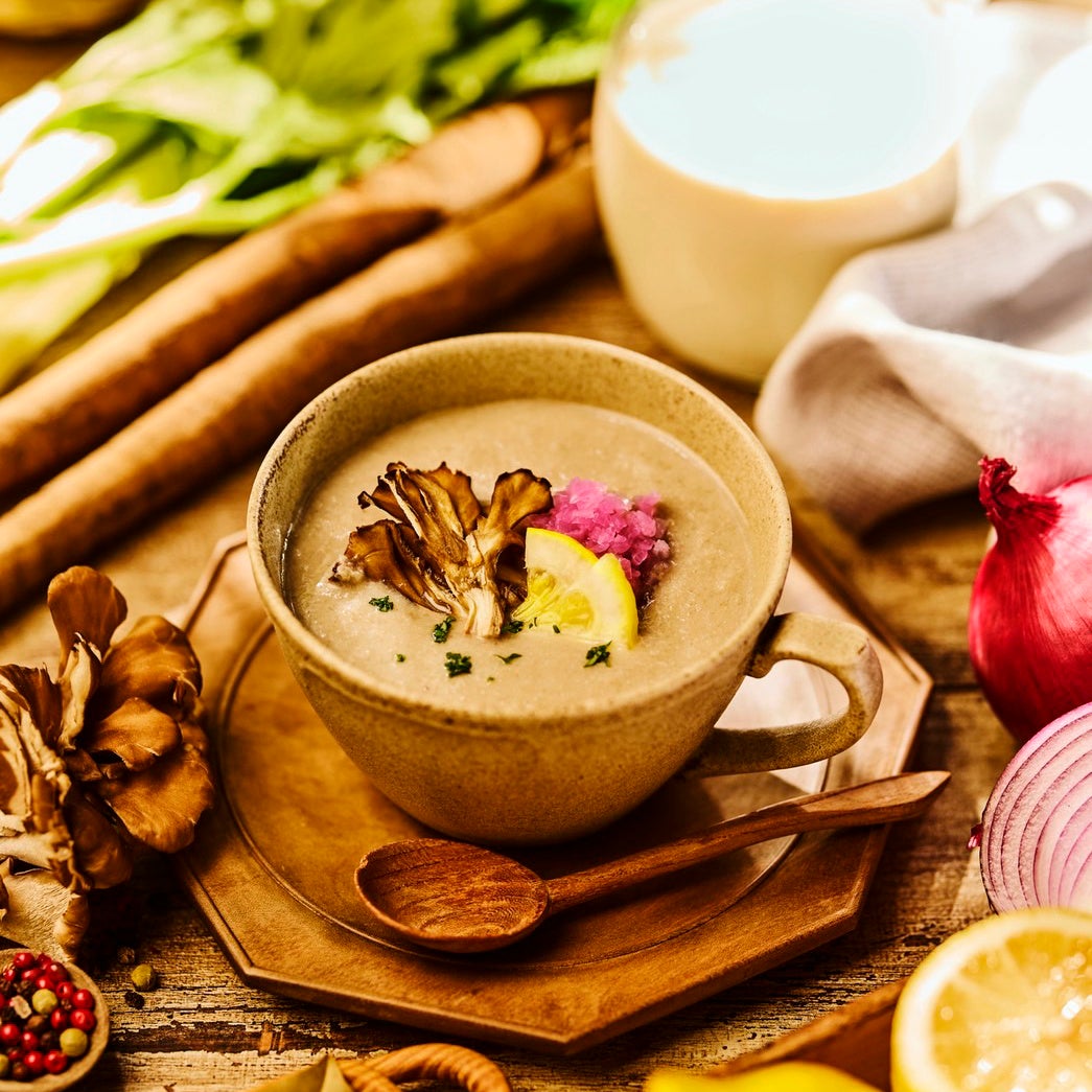 ごぼうと舞茸の豆乳ポタージュを、Farm to Meの高加水パンと一緒にどうぞ。