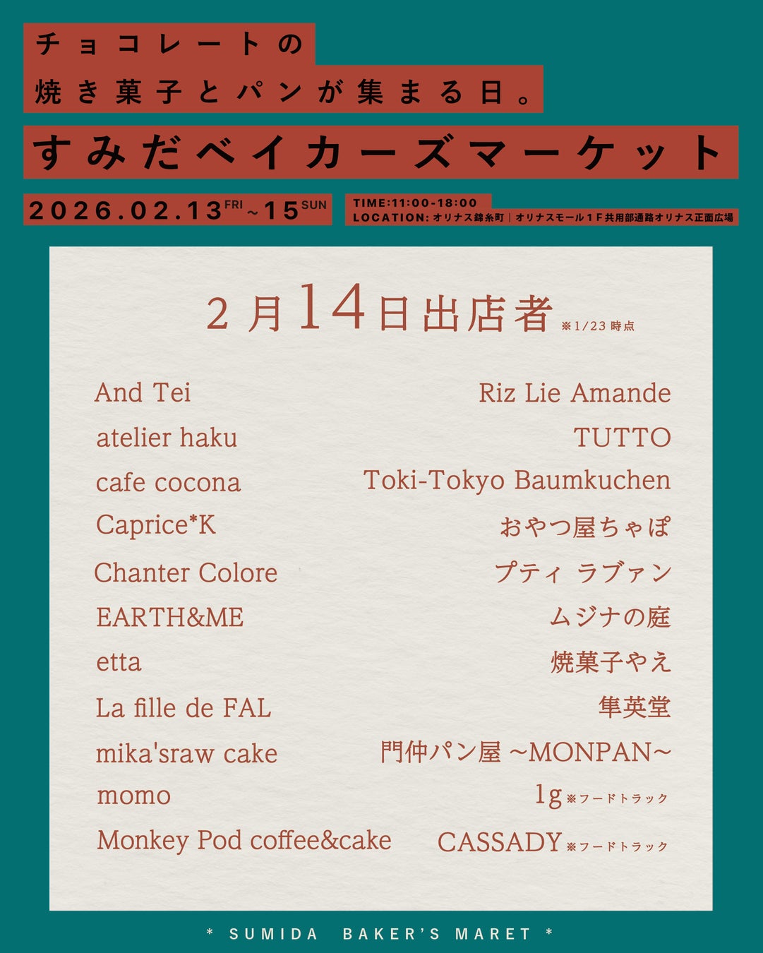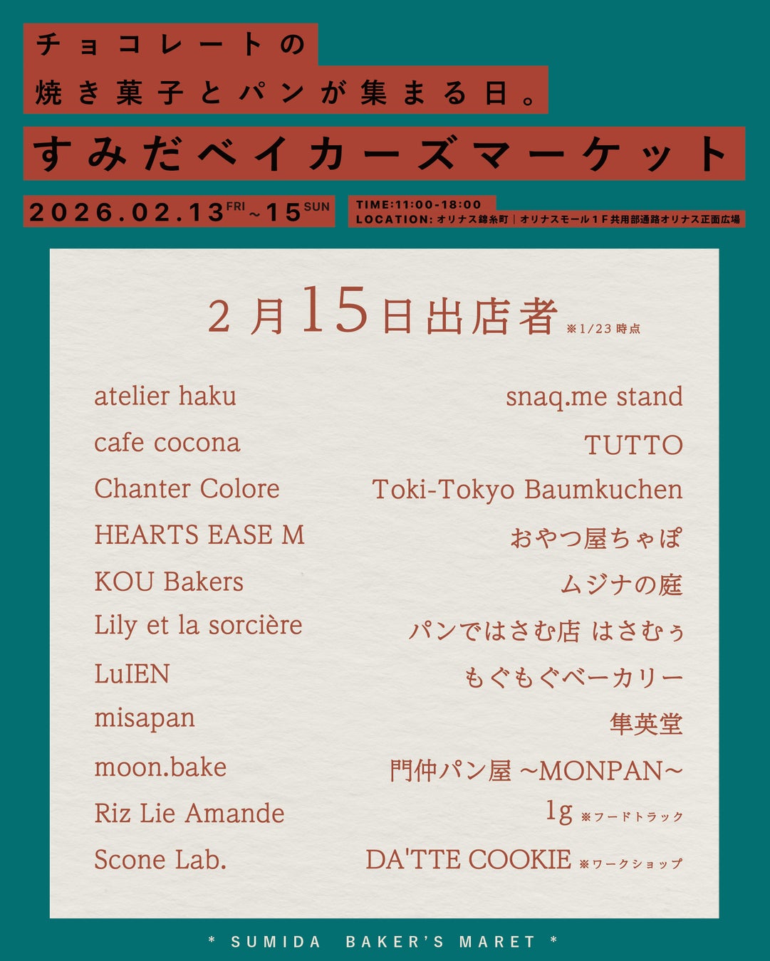 【43店舗参加】『すみだベイカーズマーケット2026』〜チョコレートの焼き菓子とパンが集まる3日間〜オリナス錦糸町で開催!【2/13(金)~15日(日)】