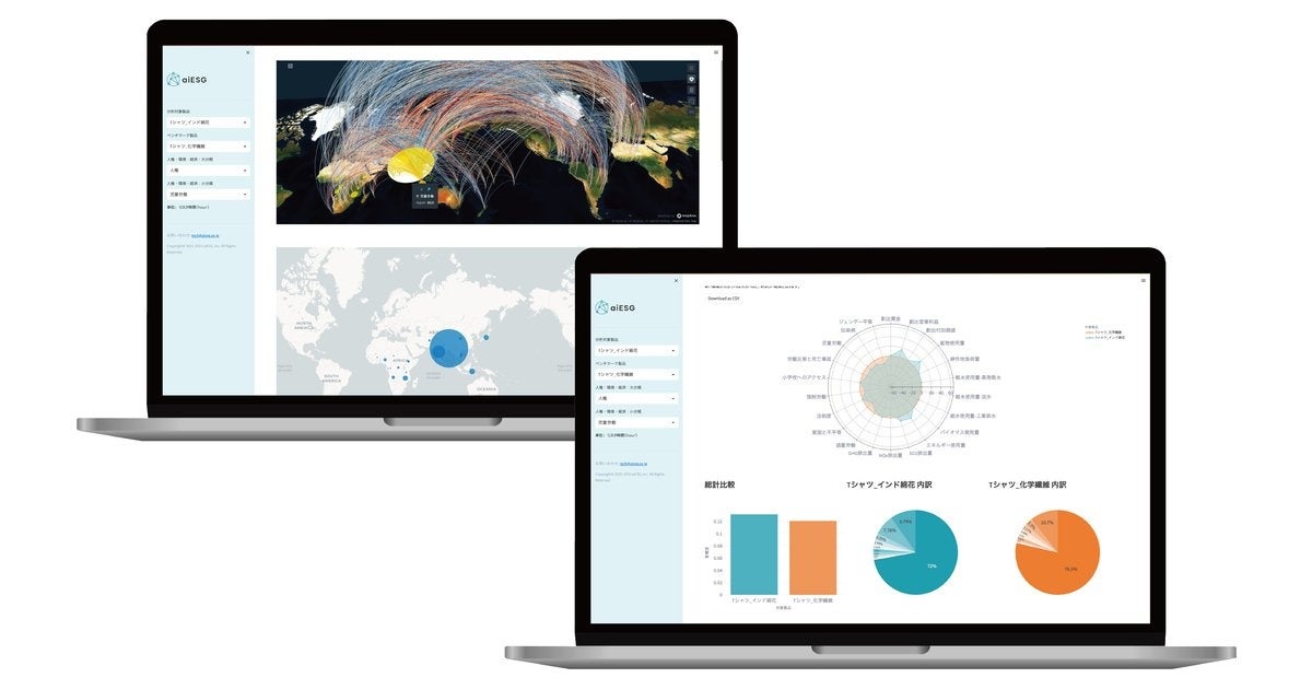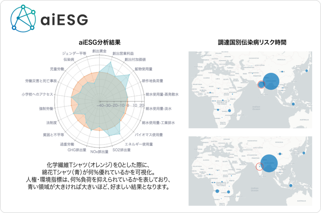 aiESGは、製品およびサービス単位でのESG評価を可能にするサービスを提供しており、サプライチェーン全体の最適化を支援します。綿花のTシャツと化学繊維のTシャツを比較することで、人権・環境負荷の低減を定量的に評価します。