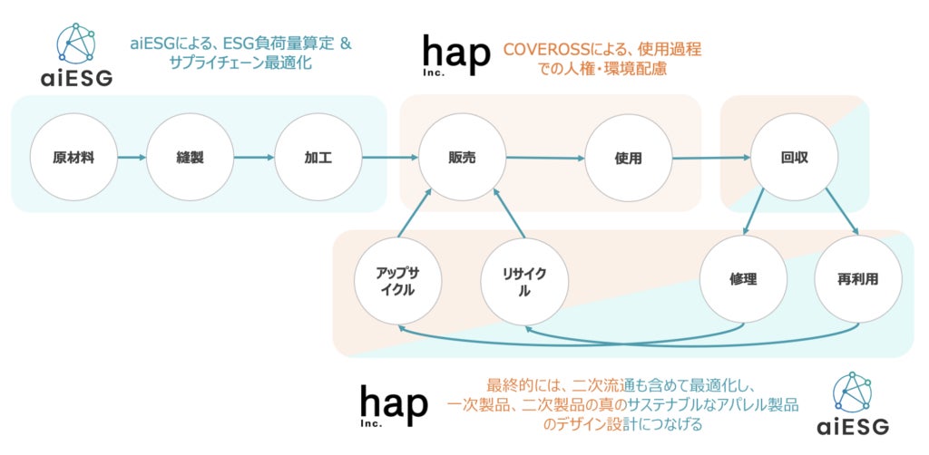 aiESGは、製品レベルのESG評価を、サプライチェーンを通じて、定量的かつ科学的に行える世界初のサービスであり、サプライチェーンの最適化に強みがあります。このたびは、サーキュラーファッション界の雄、hap社様とご一緒させて頂けることになり、大変光栄です。両者の強みを組み合わせることで、「ゆりかごから墓場まで」、真にサステナブルなファッションに向けて邁進して参ります。