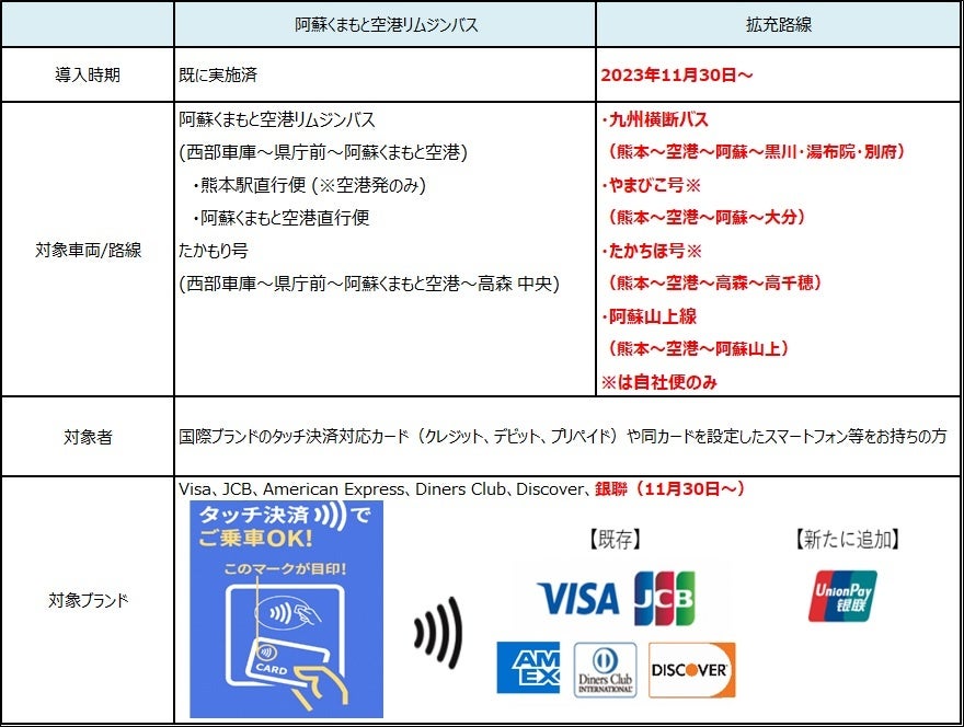 九州産交バス株式会社(本社:熊本県熊本市、代表取締役社長:岩﨑 司晃)は、クレジットカードタッチ決済乗車に関し、令和5年(2023年)11月30日から新たに4路線に導入します。また、現在取扱中のブランドに加え、銀聯ブランドを追加しますので以下の通りお知らせいたします。これにより、空港利用におけるシームレスな移動がより便利となり、今回の拡充路線は特に台湾を中心とした中華圏インバウンドの利用が増えていることから、今後のお客様の利便性向上を期待しております。