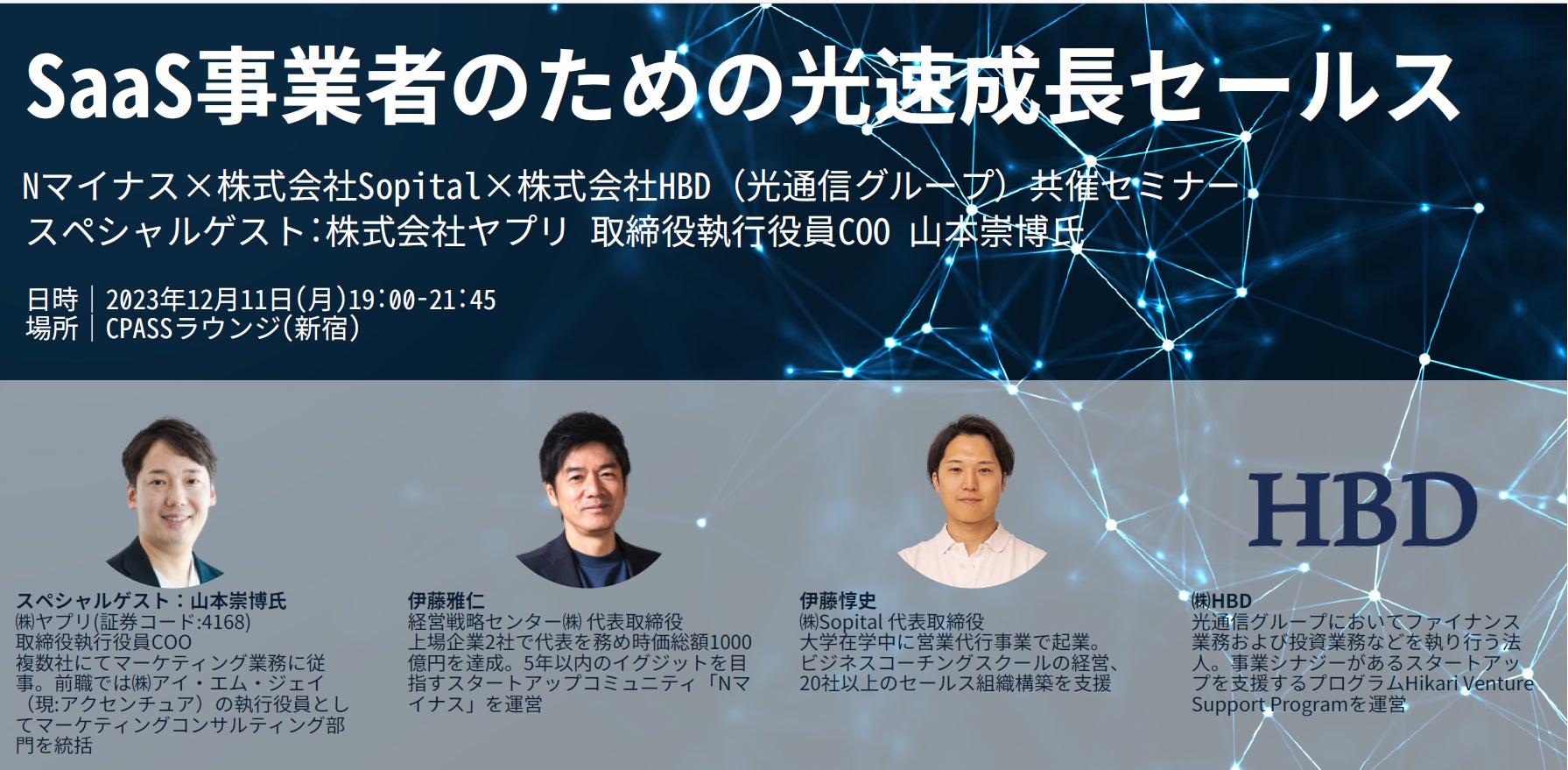 Nマイナス×株式会社Sopital×株式会社HBD(光通信グループ)共催セミナー「SaaS事業者のための光速成長セールス」スペシャルゲスト: 株式会社ヤプリ 取締役執行役員COO 山本 崇博 氏