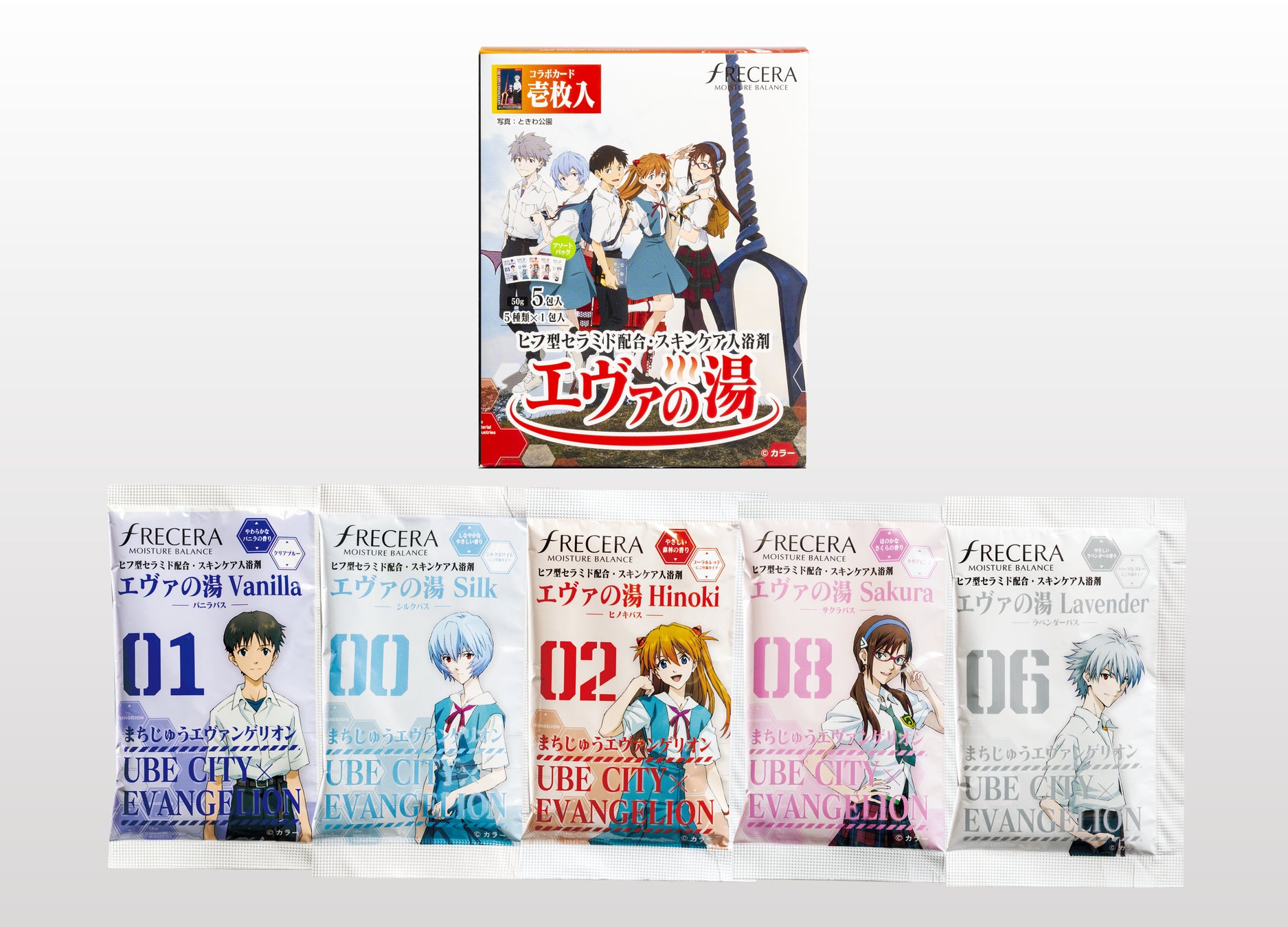 本入浴剤は5人のエヴァンゲリオンのキャラクターをそれぞれイメージした5種類の湯色と香りを新たに開発したもので、ヒフ型セラミドとヒアルロン酸をベースにしたうるおい成分が、しっとりとしたお肌を保ち、5種類のやさしい香りが毎日の疲れた心と体をリラックスさせます。また、宇部の工場群と常盤公園を背景にした2種類のオリジナルパッケージも魅力です。
