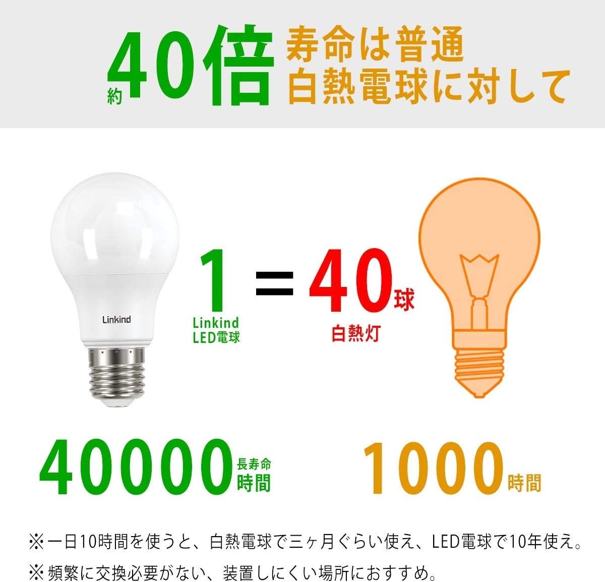 LinkindのLED電球1個の寿命は40000時間に達成、普通の白熱電球は1000時間。すなわち、一日10時間を使うと、白熱電球で三ヶ月ぐらい使え、LED電球で10年使え。頻繁に交換必要がない、装置しにくい場所におすすめ。ご注意:密閉形器具対応でき、断熱材施工器具と調光器対応できません。
