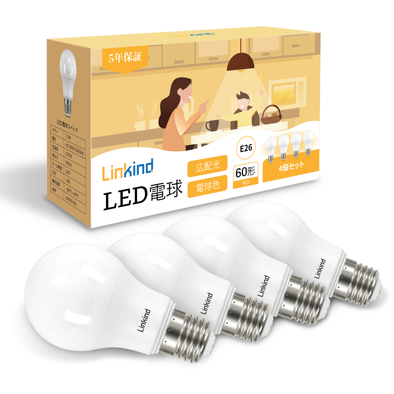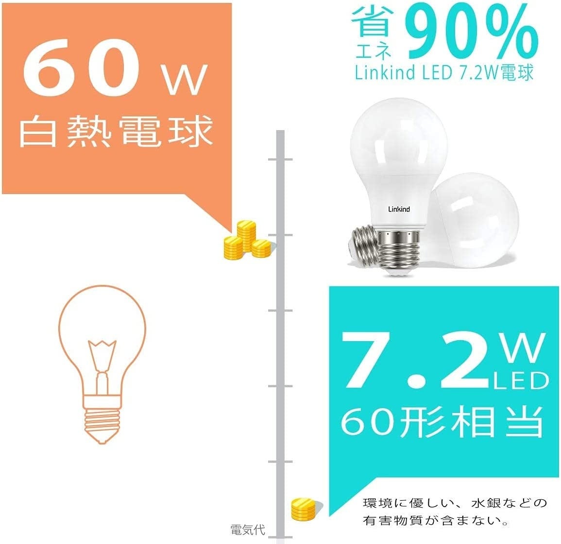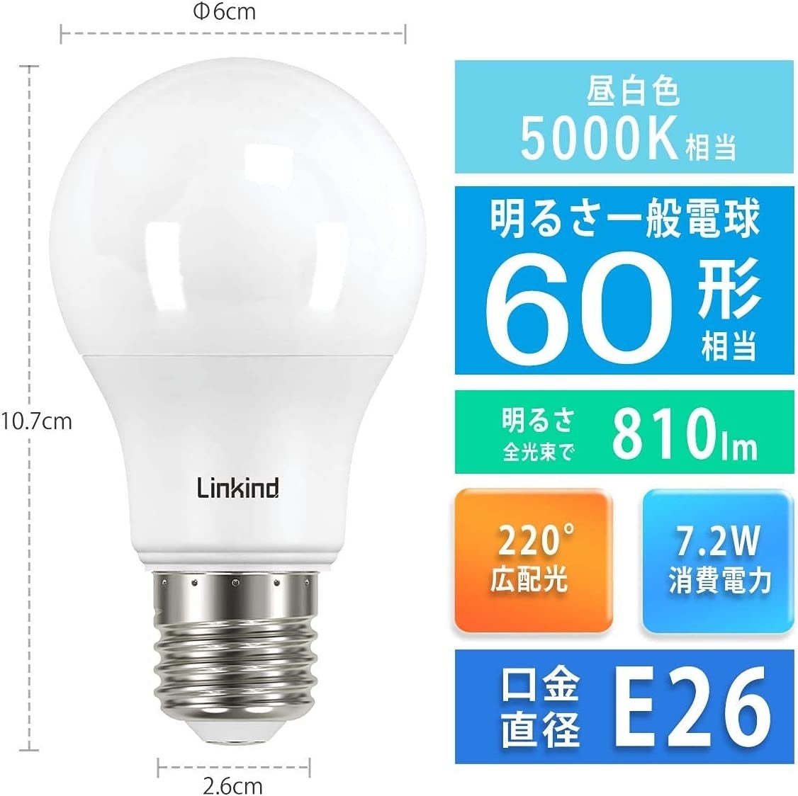 消費電力:7.2W、60形相当。電源:100V(50/60Hz共用)。サイズ:Φ6.0*H10.7cm。消費電力は90%削減できる。家計に優しい商品とも言える。220°広い配光角で四隅まで明るく照らす。全光束で440lm、すぐに明るくなります。