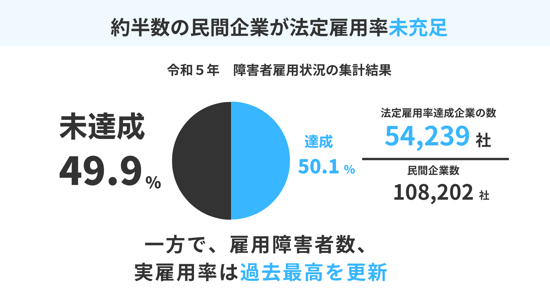 日本においては障害者雇用のペースが高まっています。これは、障害者雇用促進法で定められた「障害者雇用率制度」により、従業員の一定割合以上の障害者を雇用することが義務付けられていることが主因です。これは、いわゆる「法定雇用率」といわれることで、現在は2.3%、2024本年4月には2.5%、そして2026年4月には2.7%と段階的に高まっていきます。しかし、厚生労働省の『令和5年障害者雇用状況の集計結果』によると、54,239社/50.1%が未達成企業となっているなど、ハードルは高いのが実情です。さらに、昨今の働き手の不足、AIによる省人化などにより、2026年の法定雇用率達成は、ますます厳しくなっているのが実情です。また、厚生労働省の『障害者雇用実態調査』によると、障害者採用の課題として「会社内に適当な仕事があるか」を挙げているのが最も多く、これは統計を開始した平成15年以来全く変わっていません。