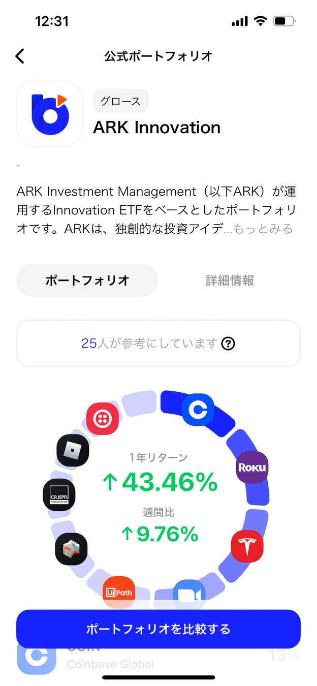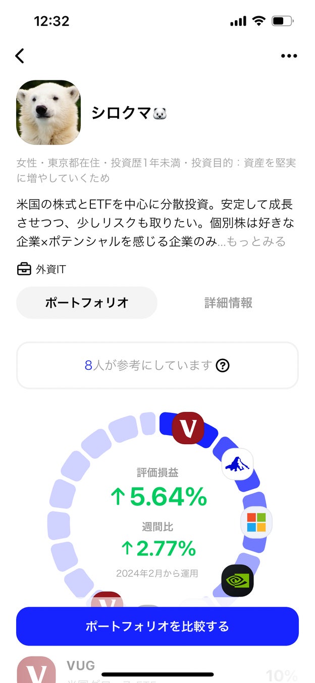 「ポートフォリオ共有」は、専門家や他のユーザーがどんなポートフォリオで投資をしているか見ることができる機能です。気に入ったポートフォリオをワンタップでコピーできて、そのまま投資を始められます。コピーしてから自分で銘柄を変更したり、アレンジすることも可能です。
