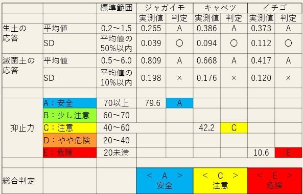 ジャガイモの土壌は、病害抑止力が79.6と高く安全な土です。キャベツの土壌は、病害抑止力が42.2と中程度であり、注意が必要な土です。イチゴの土壌は、病害抑止力が10.6と低く危険な土であることが示されました。