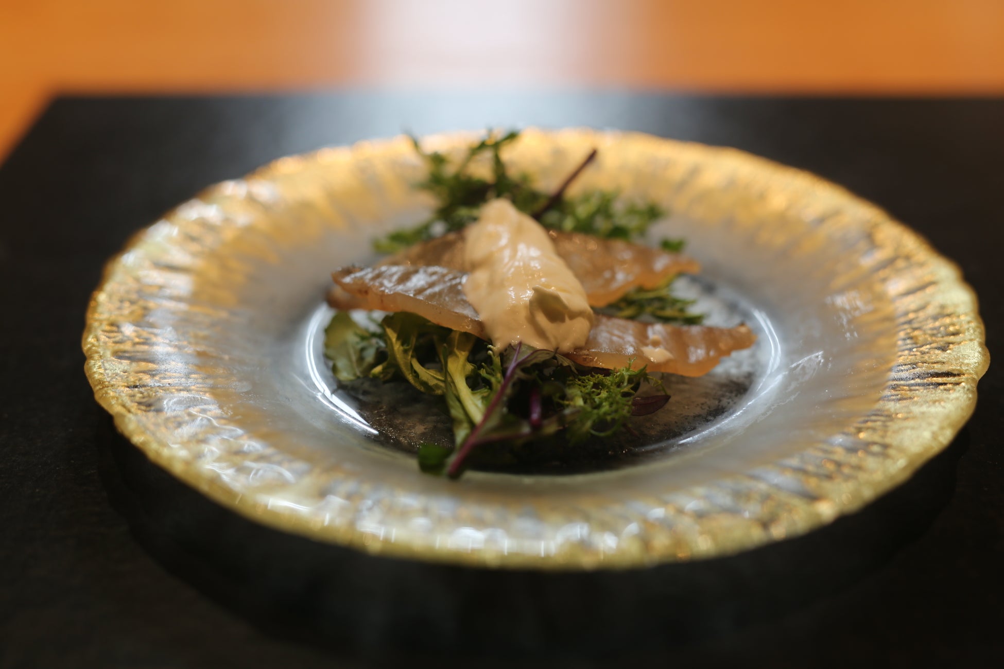 冷菜 長崎県産鰆の昆布締めカルパッチョ マスカルポーネとゆうこうのピューレ