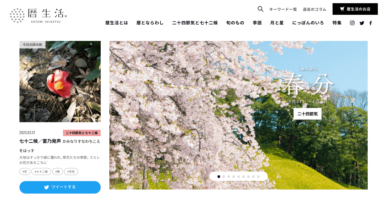 暦生活は、1922年創業のカレンダーメーカーである新日本カレンダー株式会社が運営するWebメディアです。日本の季節を楽しむ暮らしを「暦生活」と名付けて提案しており、季節の行事や旬のものを毎日発信するX(旧Twitter)のフォロワー数は29.1万人、Instagramのフォロワー数は19.8万人(※1)を数えます。