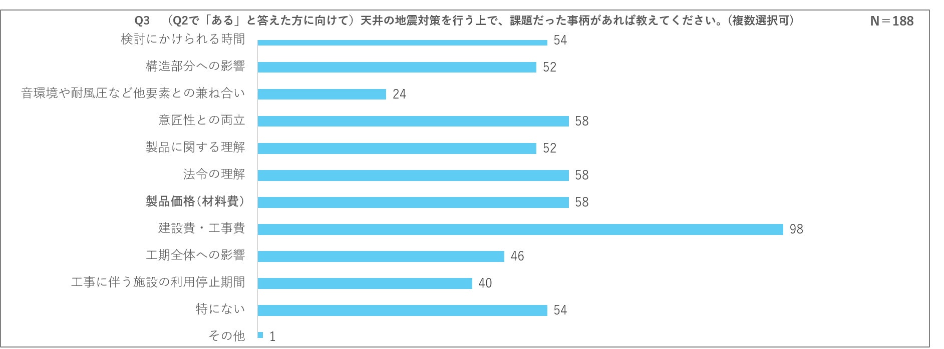 【Q3 (Q2で天井の地震対策に「携わったことがある」と答えた方に向けて)天井の地震対策を行う上で、課題だった事柄があれば教えてください。(複数選択可)】