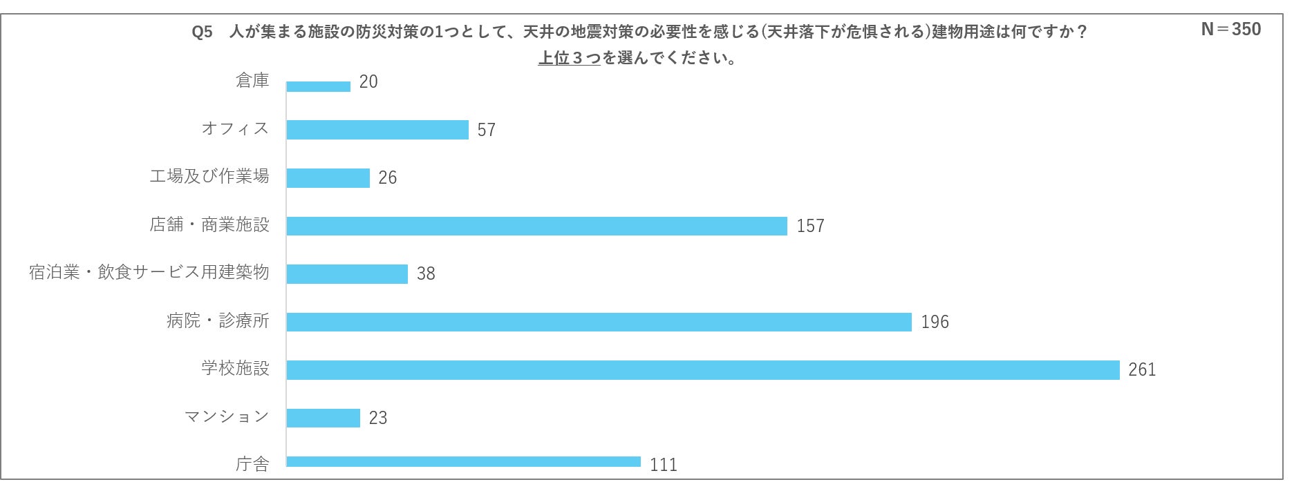 【Q5 人が集まる施設の防災対策の1つとして、天井の地震対策の必要性を感じる(天井落下が危惧される)建物用途は何ですか?上位3つを選んでください。】