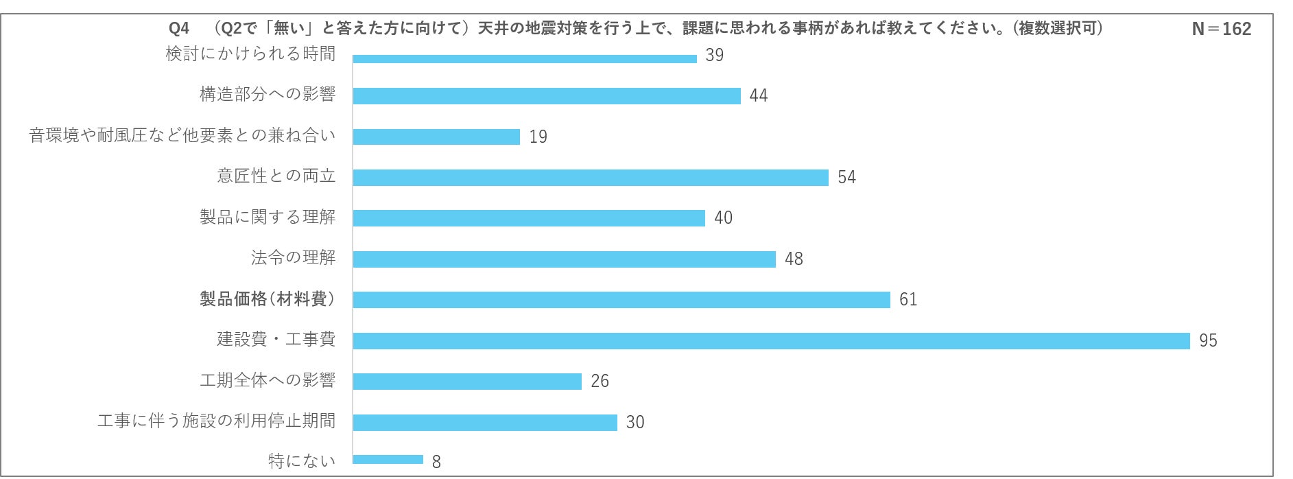 【Q4 (Q2で天井の地震対策に「携わったことが無い」と答えた方に向けて)天井の地震対策を行う上で、課題に思われる事柄があれば教えてください。(複数選択可)】