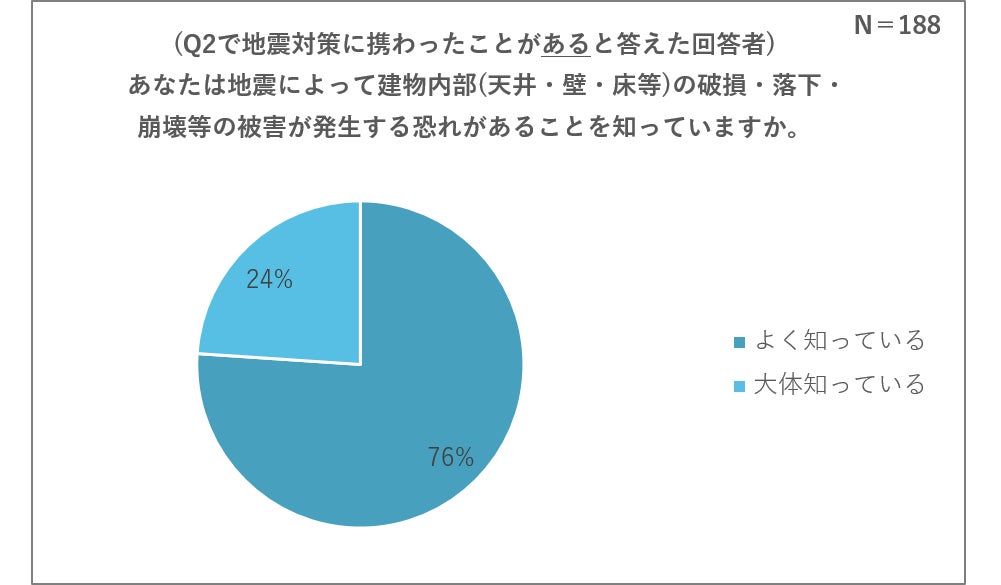 今回のアンケートでは、地震によって建物内部(天井・壁・床等)の破損・落下・崩壊等の被害が発生する恐れがあることについて95%の回答者が認知しているという結果になりました。