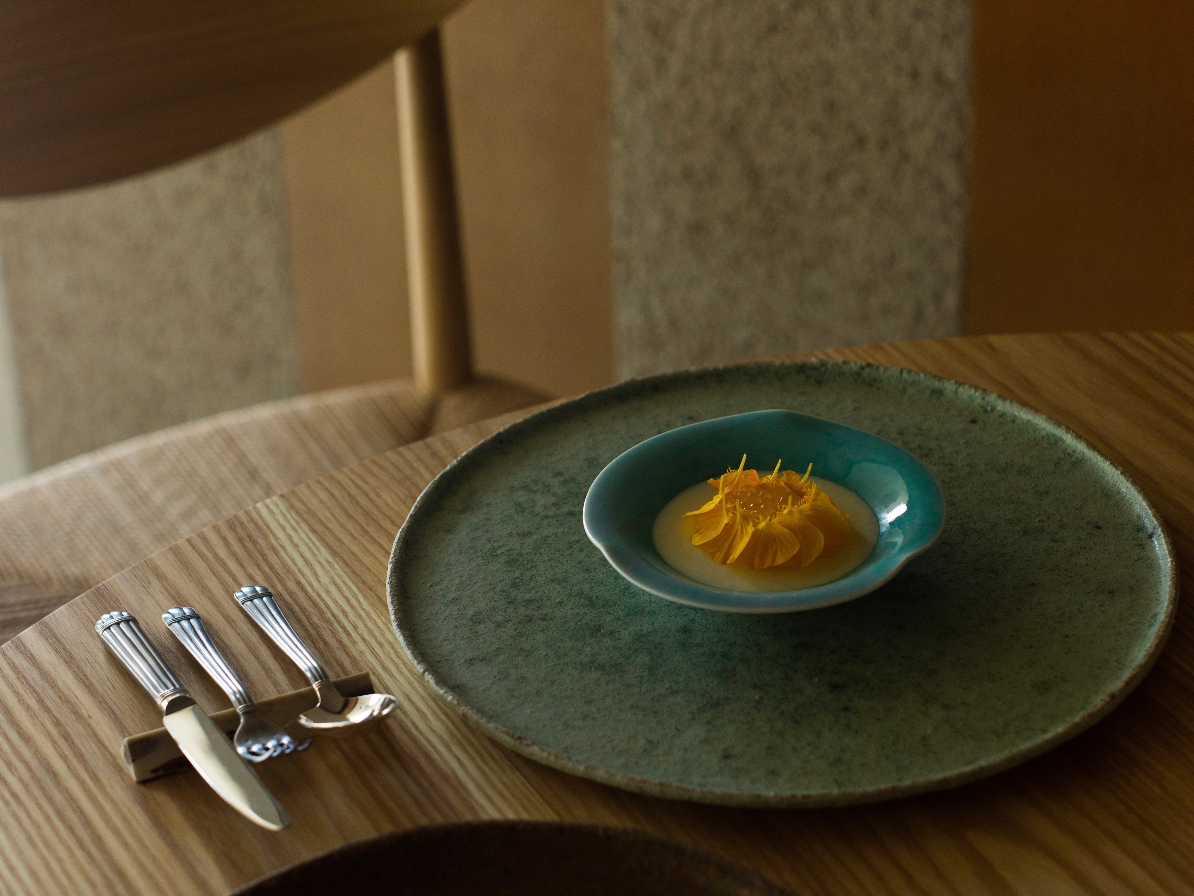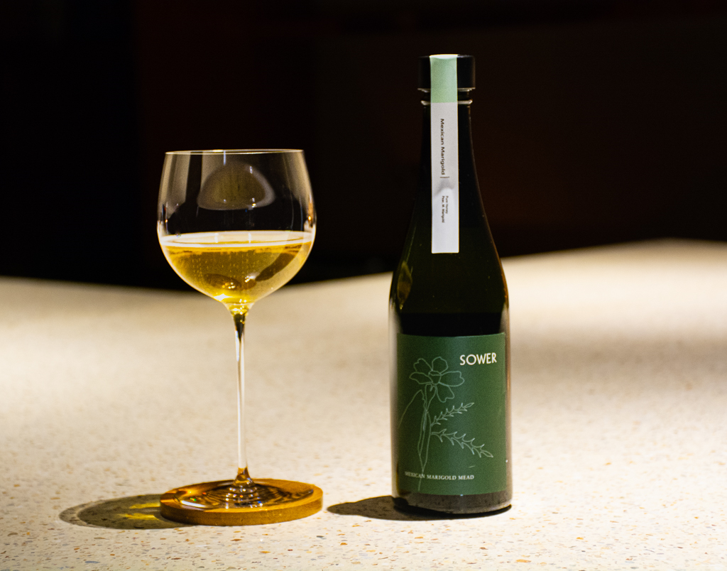 SOWERの庭に咲いたメキシカンマリーゴールドを早朝に摘み、新芽のみを使って発酵させたもの。ウェルカムドリンクにふわさわしいスパークリングミードは、ドライさを保ちながら柔らかさを表現するために、滋賀県の農園で採れた梨も加えて仕込んでいます。