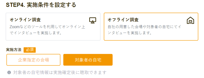 オフライン調査では「ユーザー宅への訪問調査」と「指定会場での対面調査」の2種類の募集が可能です。