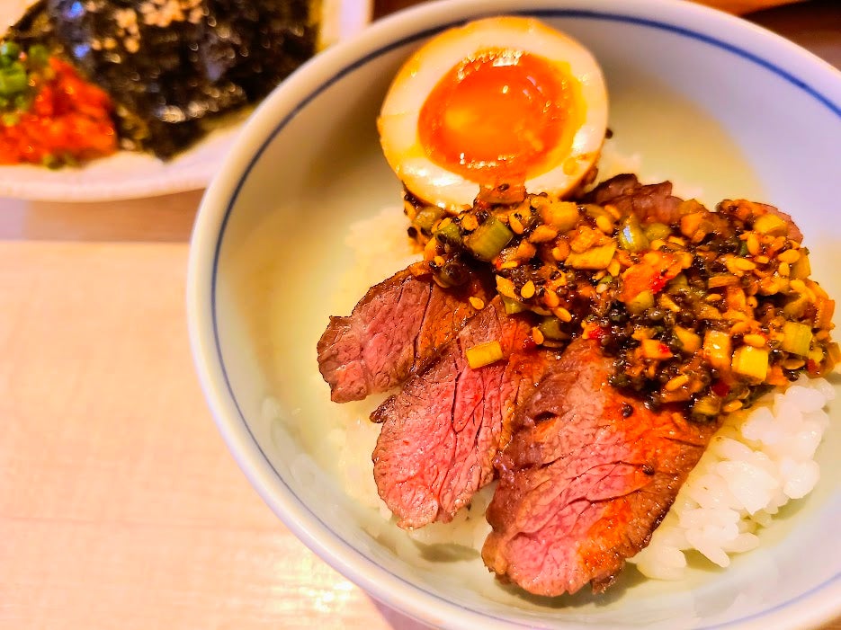 極厚のハラミにニンニクを効かせた特製ダレと一緒に、ご飯、煮卵、韓国のり、チャンジャをお好みに合わせてトッピングして食べることで、さらにジャンクに炭水化物を食べることができ、ダメ人間になることができます。