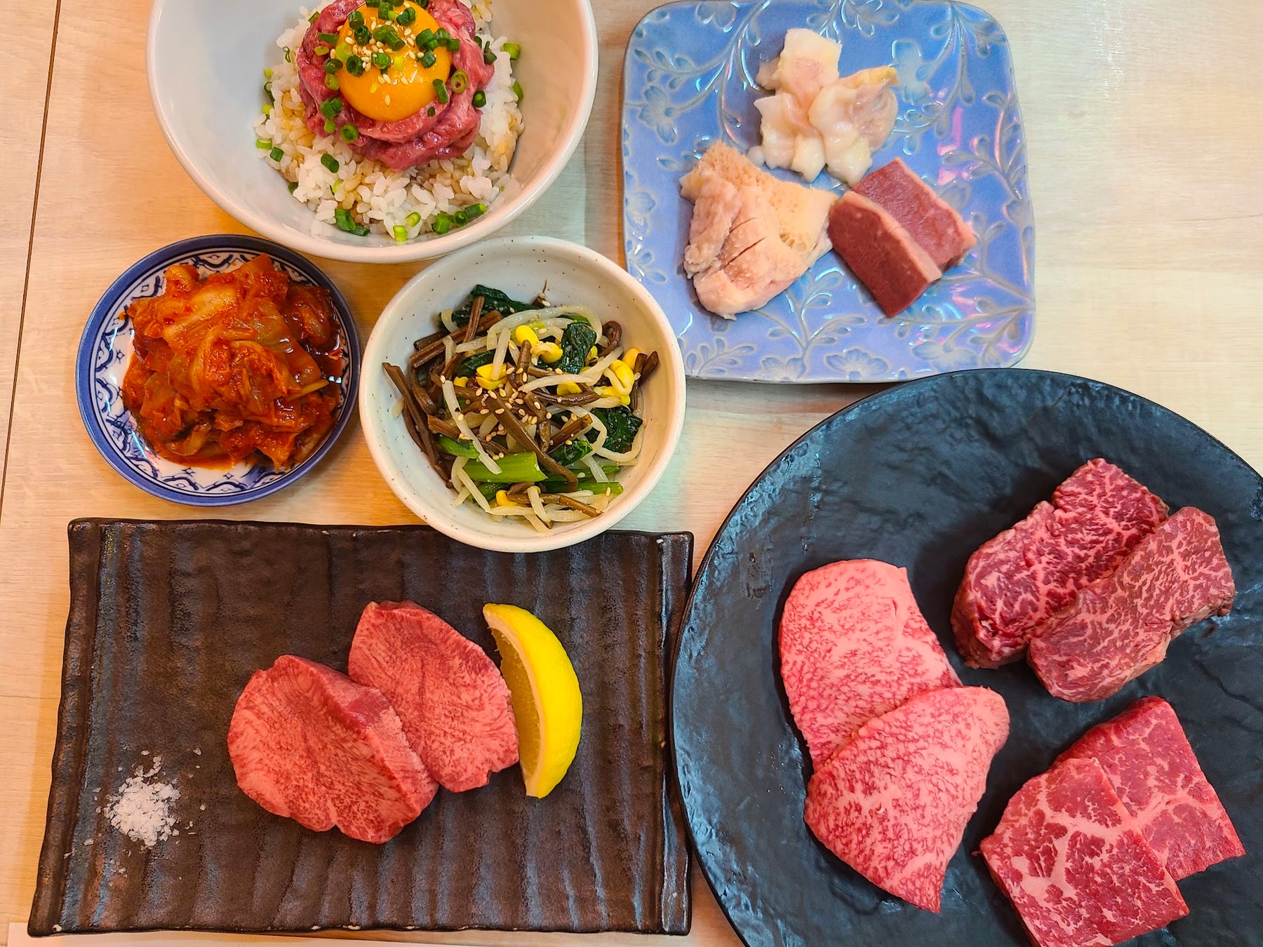 上ハラミと上ロースの贅沢な味わい、ネギたんの繊細な風味、さらには5種類のホルモンの濃厚な旨みが楽しめます。キムチやナムルのピリ辛さがアクセントとなり、お腹いっぱい満足感を与えるセットです。