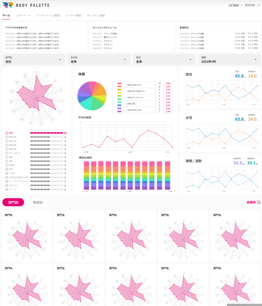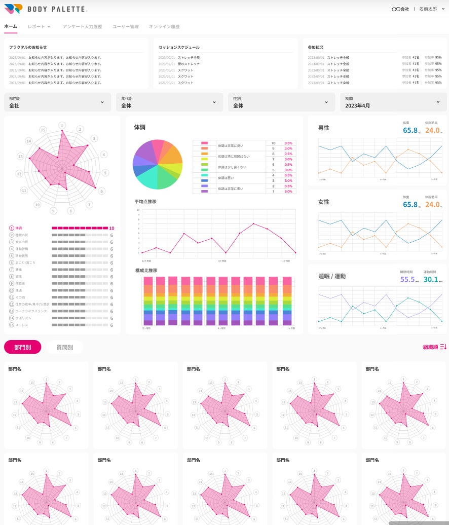 ボディパレットでは体調の自己評価をモニタリングすることで、「健康状態を見える化」し健康課題を早期に解決することが可能です。現在ボディパレットは法人様向けに展開しており、組織全体、部署毎、個人のデータから組織の健康課題の早期発見を実現しています。