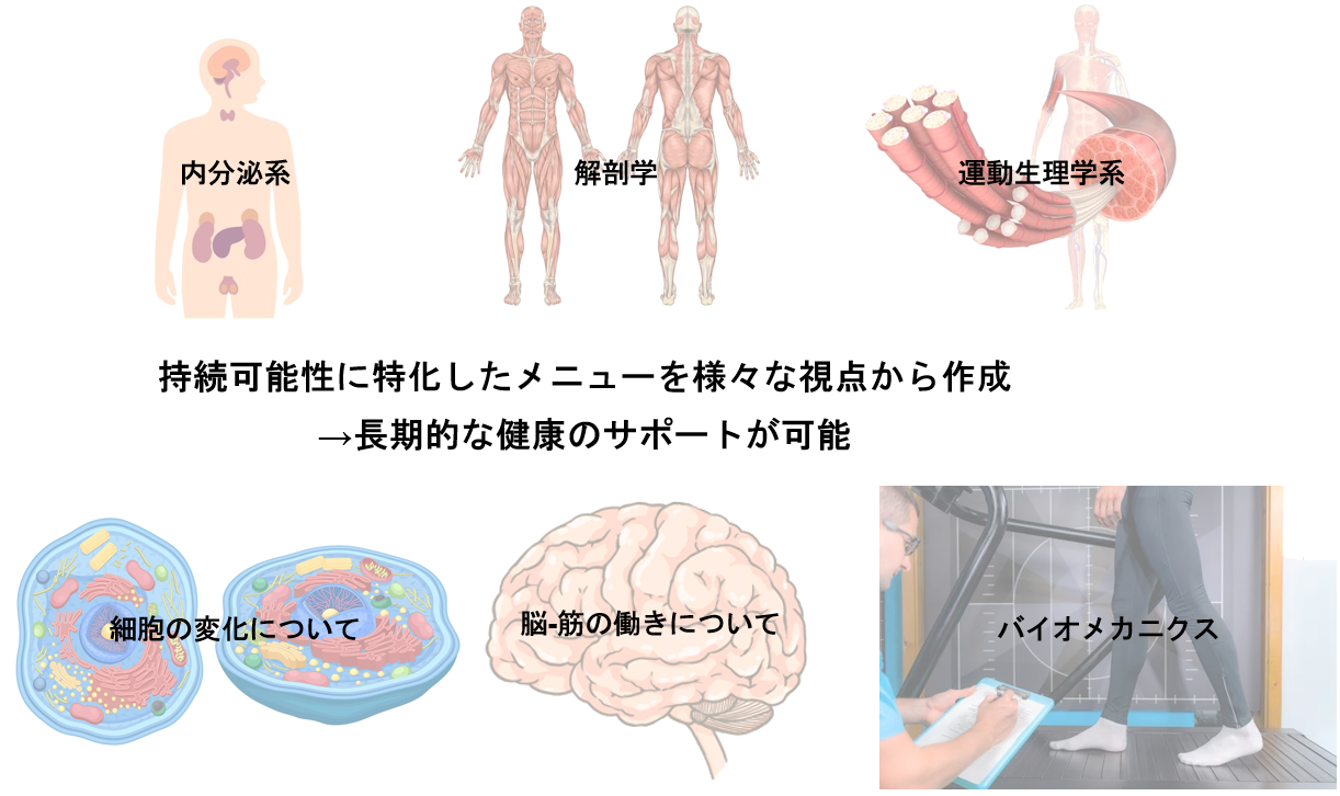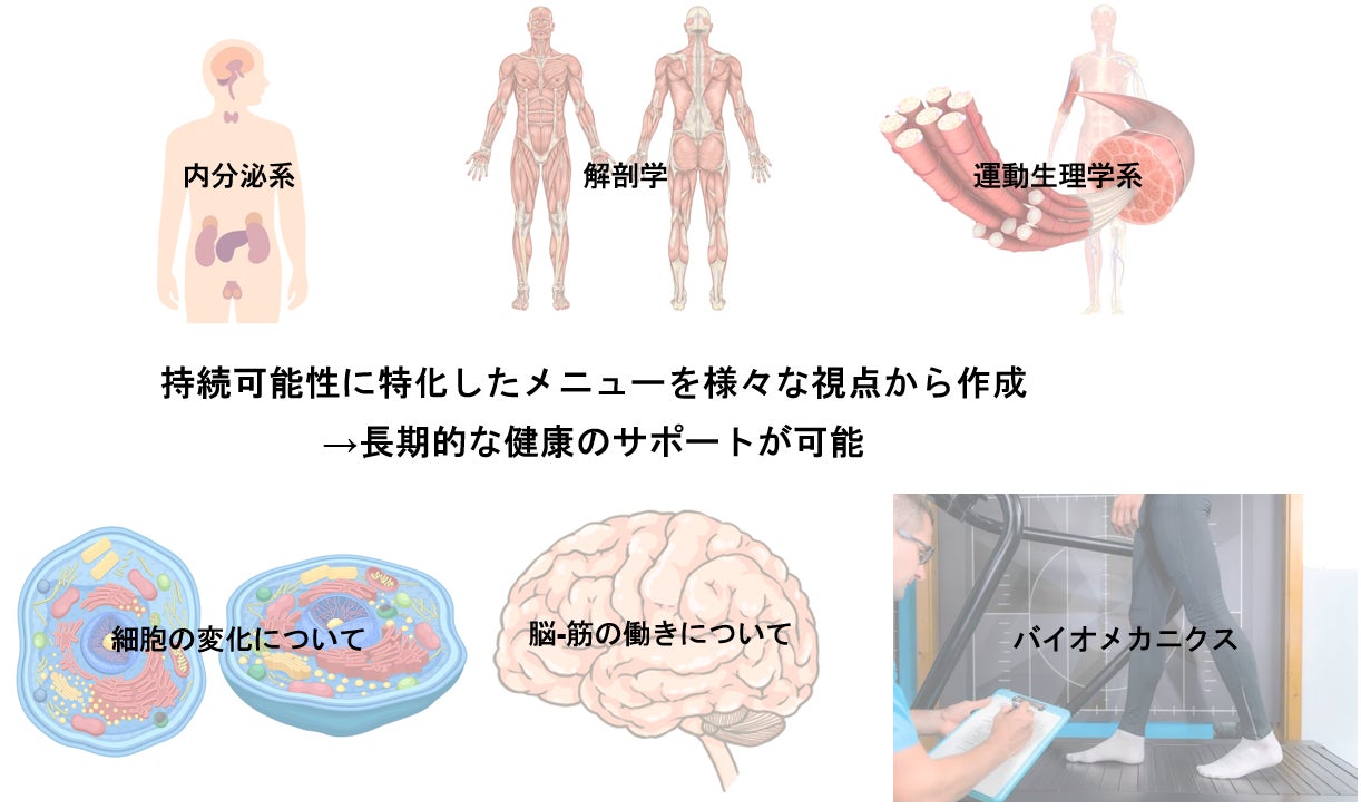 その運動習慣に対して様々な運動分野から学術的な背景を取り込んだメソッド=『フラクタルメソッド』を構成し、ミクロの視点(細胞、筋肉、生理活性物質etc...)とマクロの視点(生産性、メンタル、パフォーマンスetc...)で予防医療に貢献しています。
