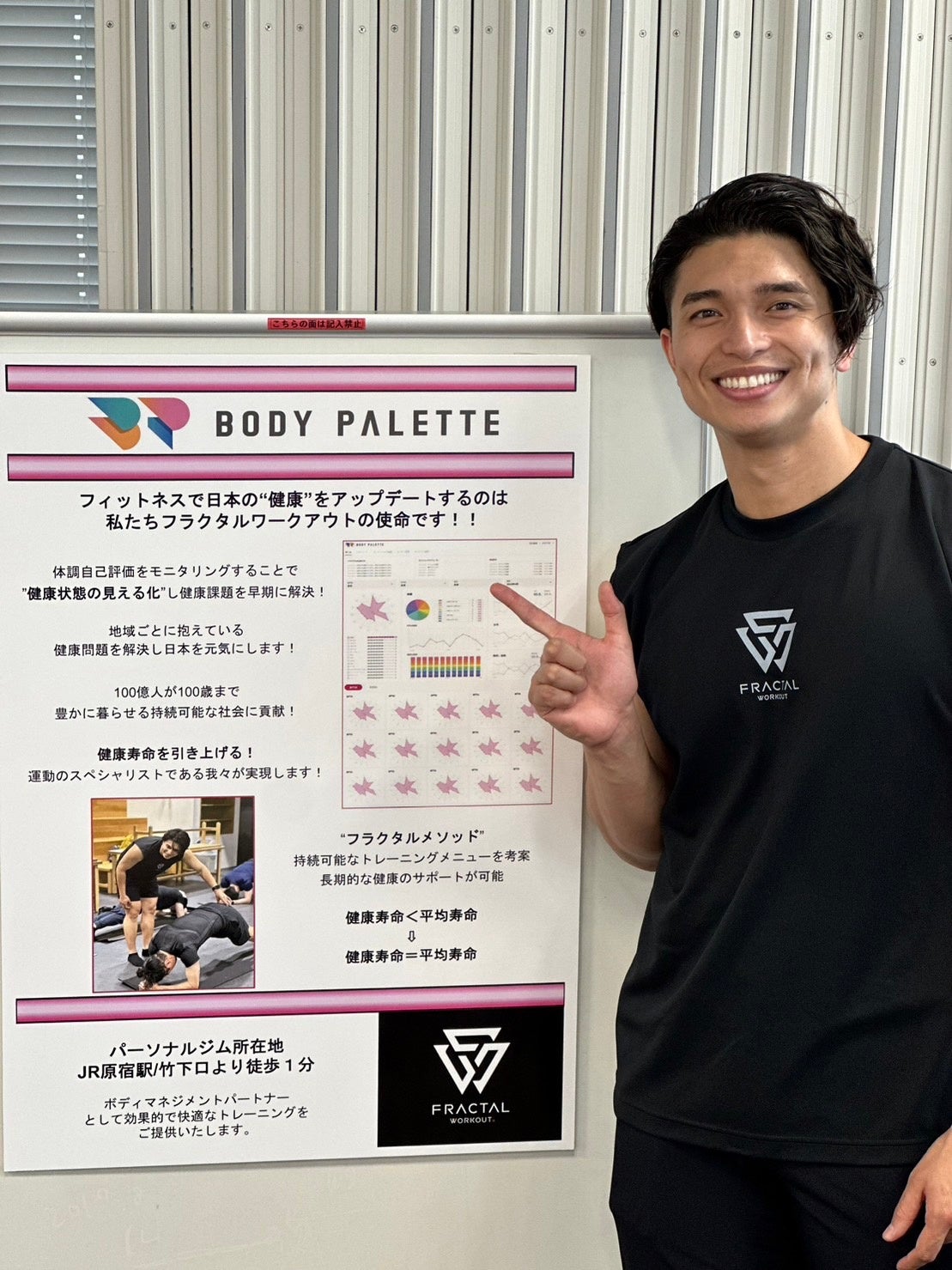 toC向けでは経営者の為のパーソナルトレーニングジム「フラクタルワークアウト」を原宿駅前で運営を行い、toB向けでは社員の為のオンラインフィットネス「ボディパレット」を提供しています。