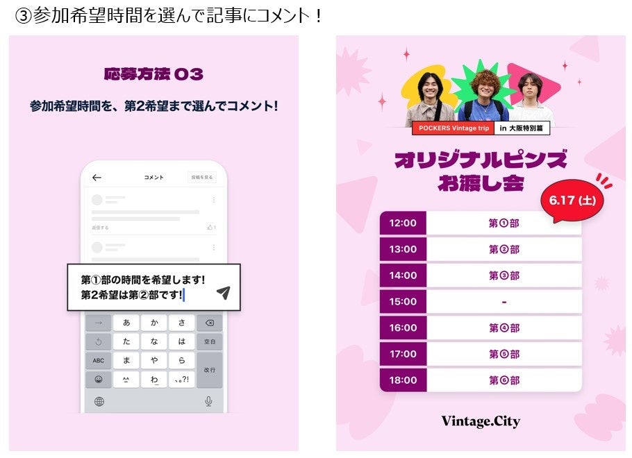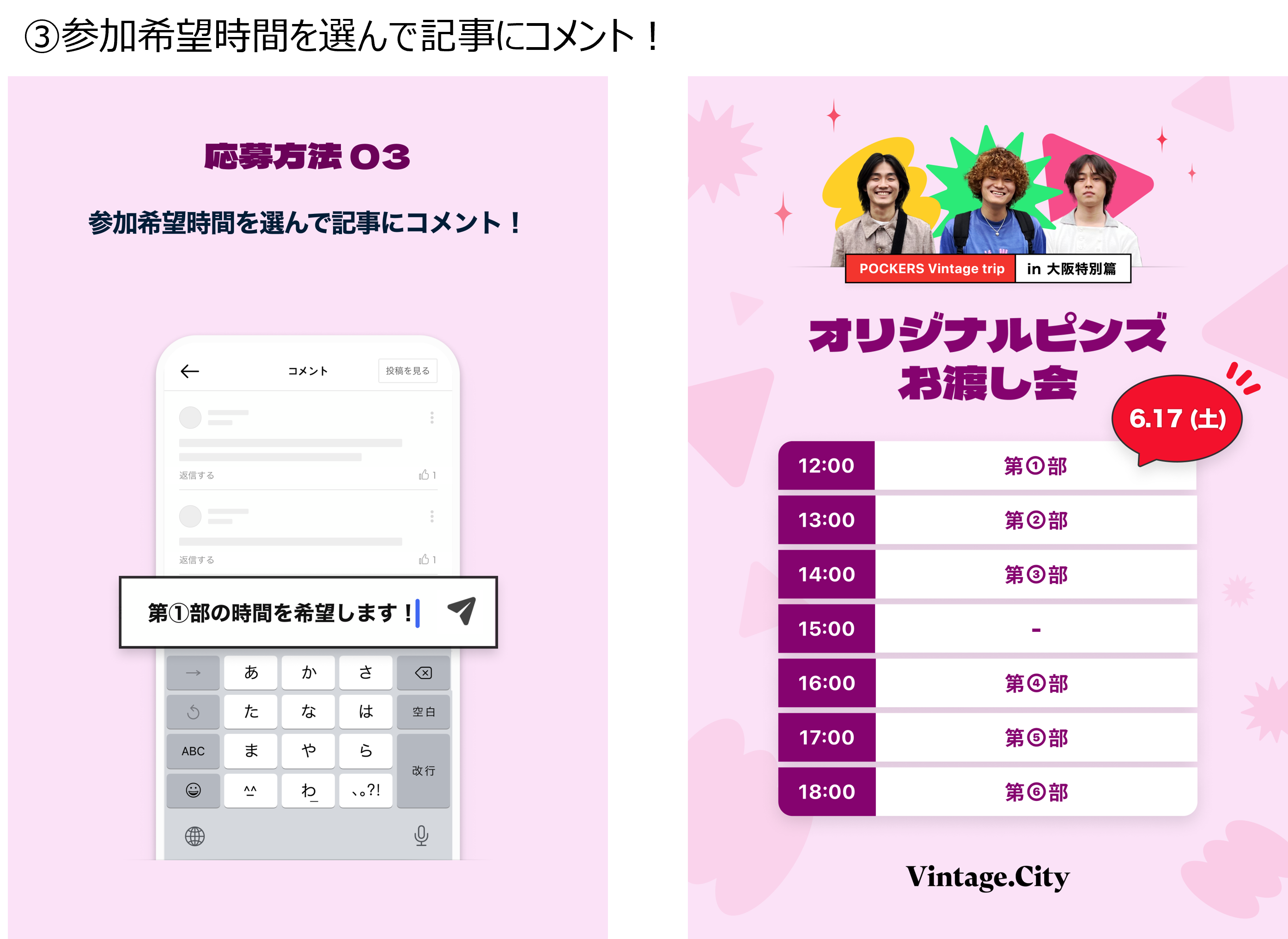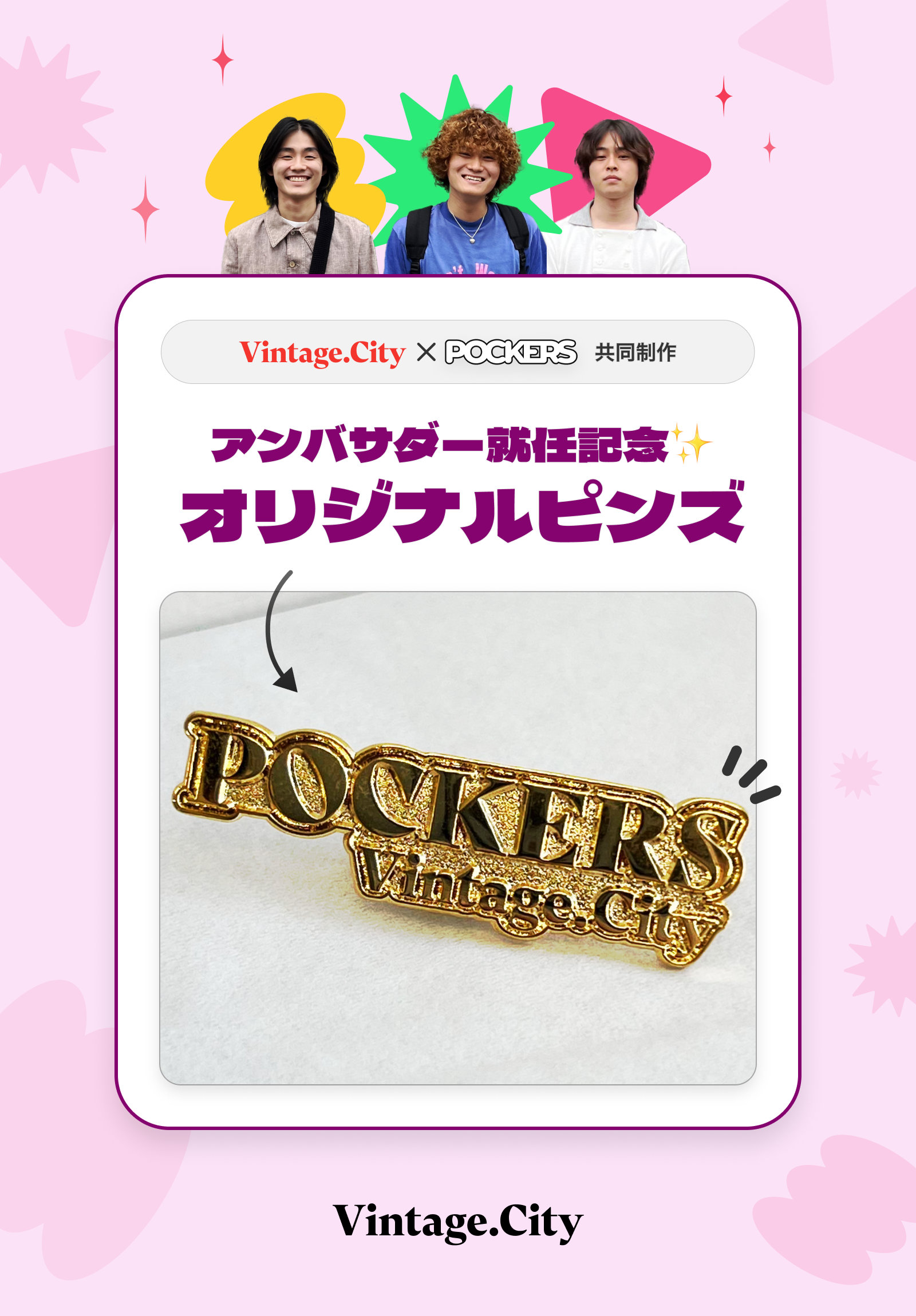 ポーカーズ×Vintage.Cityのオリジナルコラボピンバッジを、ポーカーズ本人からお渡しをする“お渡し会”を実施します。お渡し会には、対象期間中にVintage.Cityで商品を購入された方の中から抽選で300名様をご招待します。
