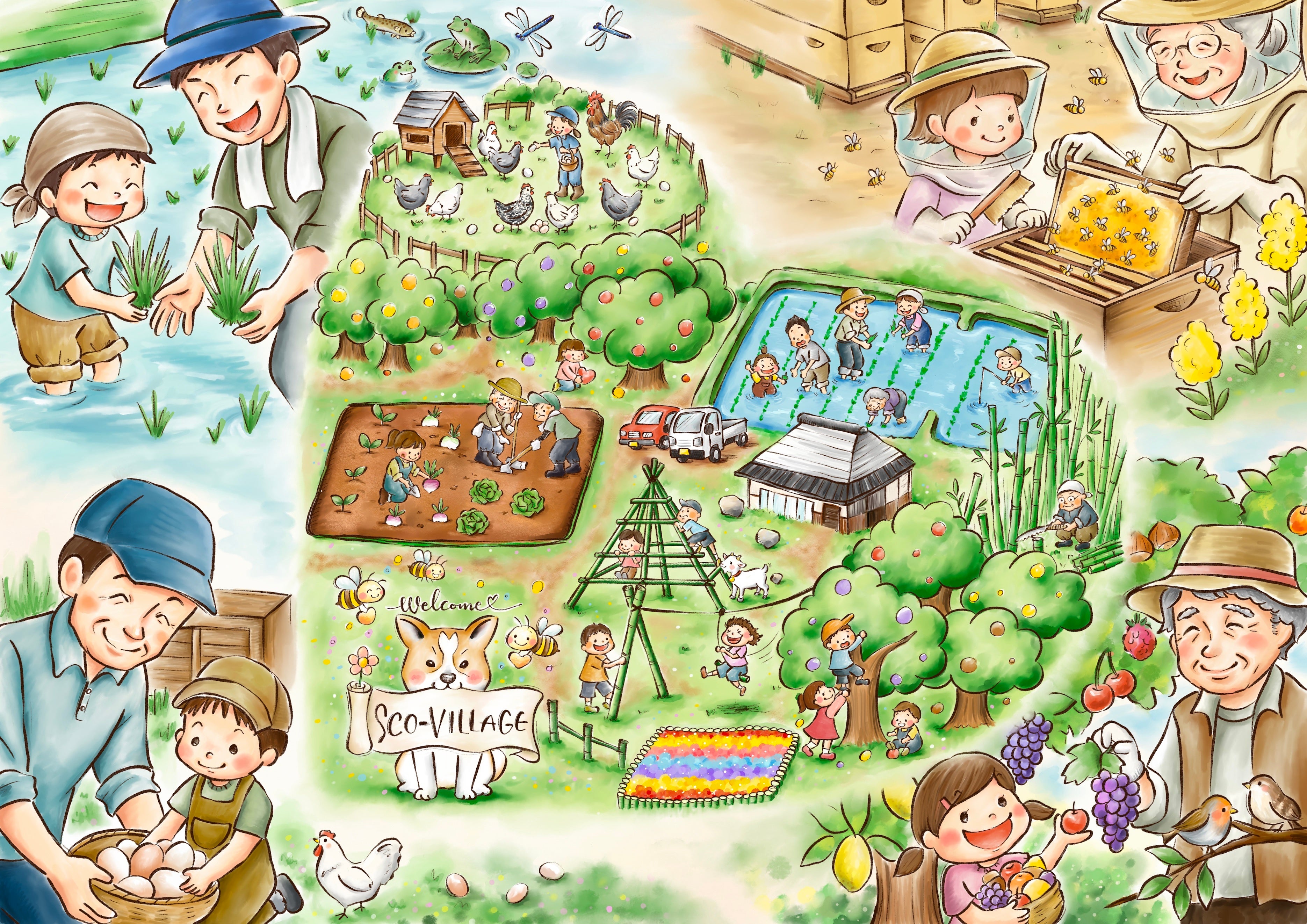現在、自然栽培、平飼い養鶏、ニホンミツバチの養蜂などを通じて、「命がめぐる循環型農業」を子どもと大人がともに学び実践する場「スコビレッジ」づくりを進めています。