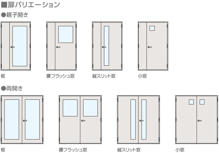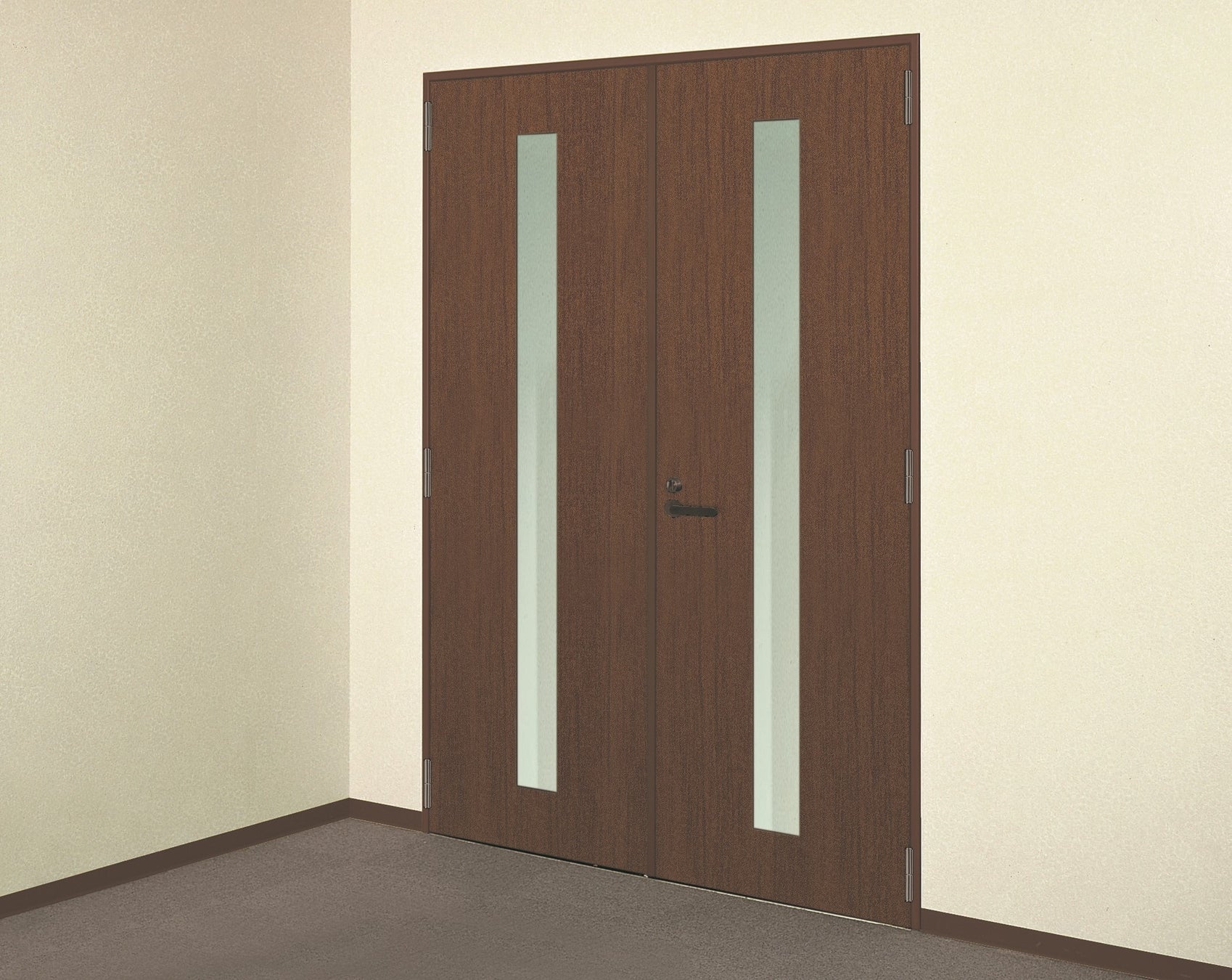 特定防火設備でありながら、扉が軽量のため開閉が容易で、出入りが多い会議室や工場内の事務所、病院などに適しています。また、表面材のデザインは全48種類をラインアップ。空間の雰囲気に合わせて最適なものを選択いただけます。さらに、ドアバリエーションは両開きと親子開きを品揃え。スリット窓・腰フラッシュ窓・小窓等、様々な窓デザインにも対応しているため、場所や用途に合わせた柔軟な対応が可能で、火災時の安全を確保しながら、意匠性や利便性も保ちます。