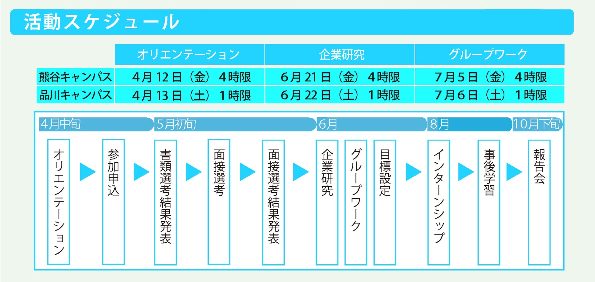 1Dayや半⽇の短期のプログラムではなく、⼤学推薦であるシン・インターンシップの参加には、厳しい学内選考があります。 この学内選考とは、書類選考、次に⾯接により実習希望者の通常授業への取り組み姿勢、成績評価な どを総合して選抜することから、⾃分のキャリアを真⾯⽬に考えている、意識が⾼い学⽣だけが参加を希望しています。 したがって、単なる就活のためにとりあえずインターンシップに申し込んだという学⽣ではないこと から、受け⼊れる企業側としても、優秀な学⽣とともに課題解決に取り組むことができるのです。