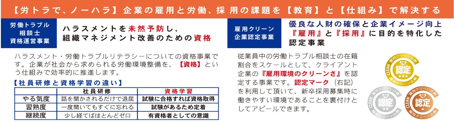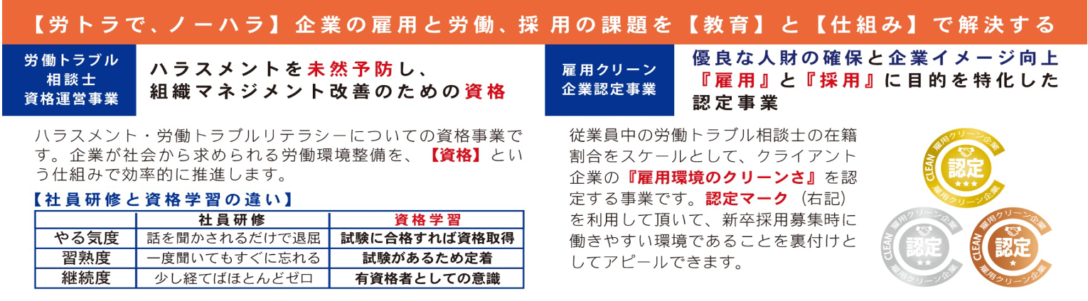 【労働トラブル相談士 資格運営事業】職場でのハラスメントや労働トラブルの未然予防で生産性向上を図ります。