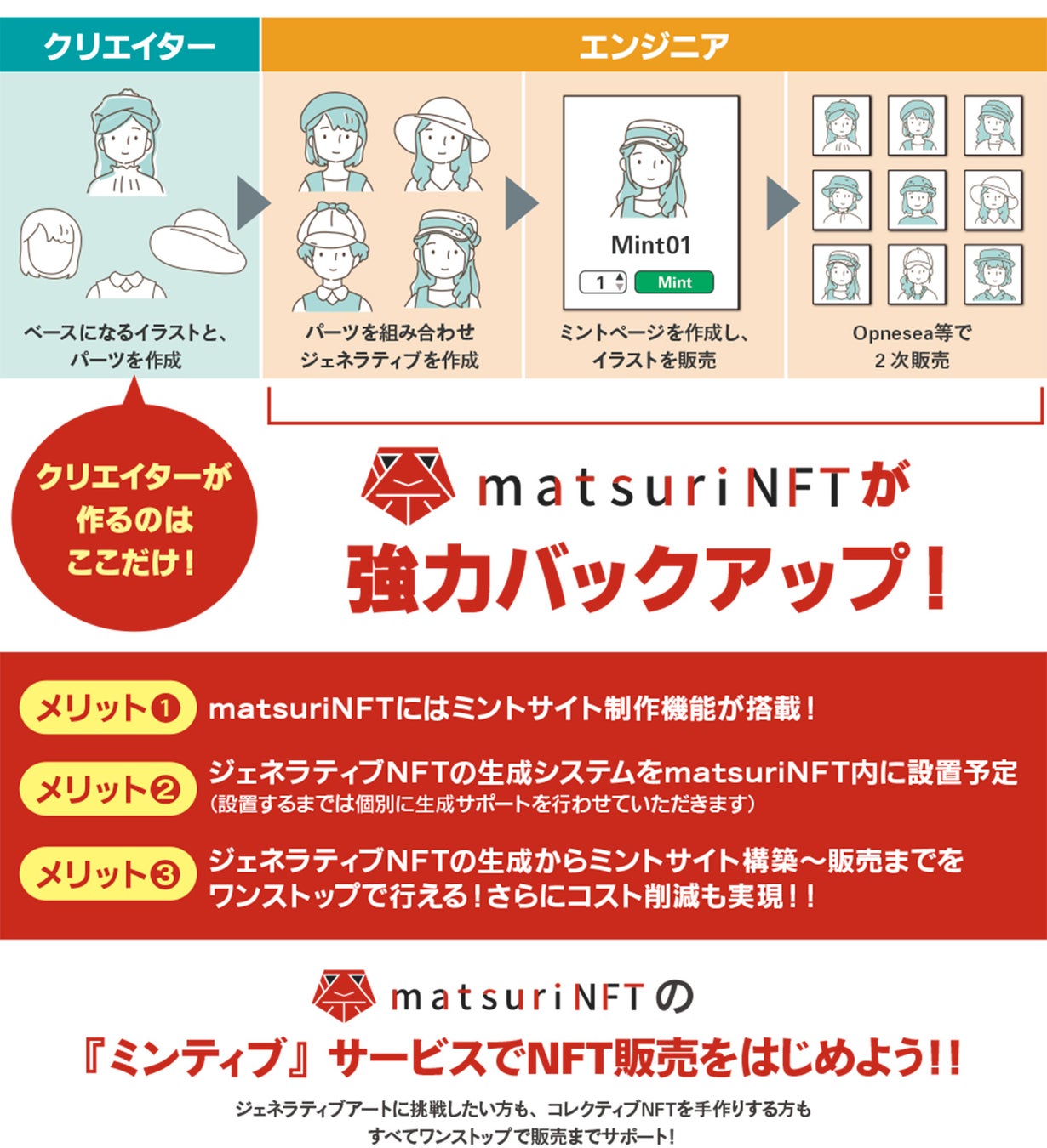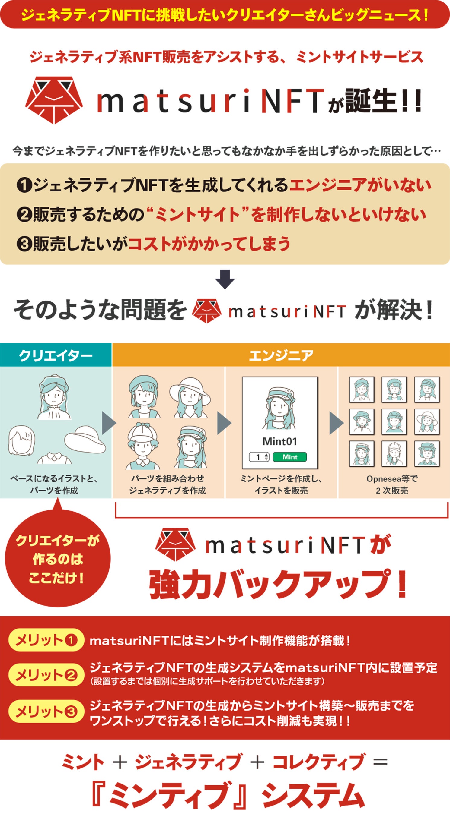 NFTクリエイターの夢を叶える!ジェネラティブNFTを生成からミントサイト構築までを手軽に。matsuriNFTの『ミンティブ』サービスで始めよう。