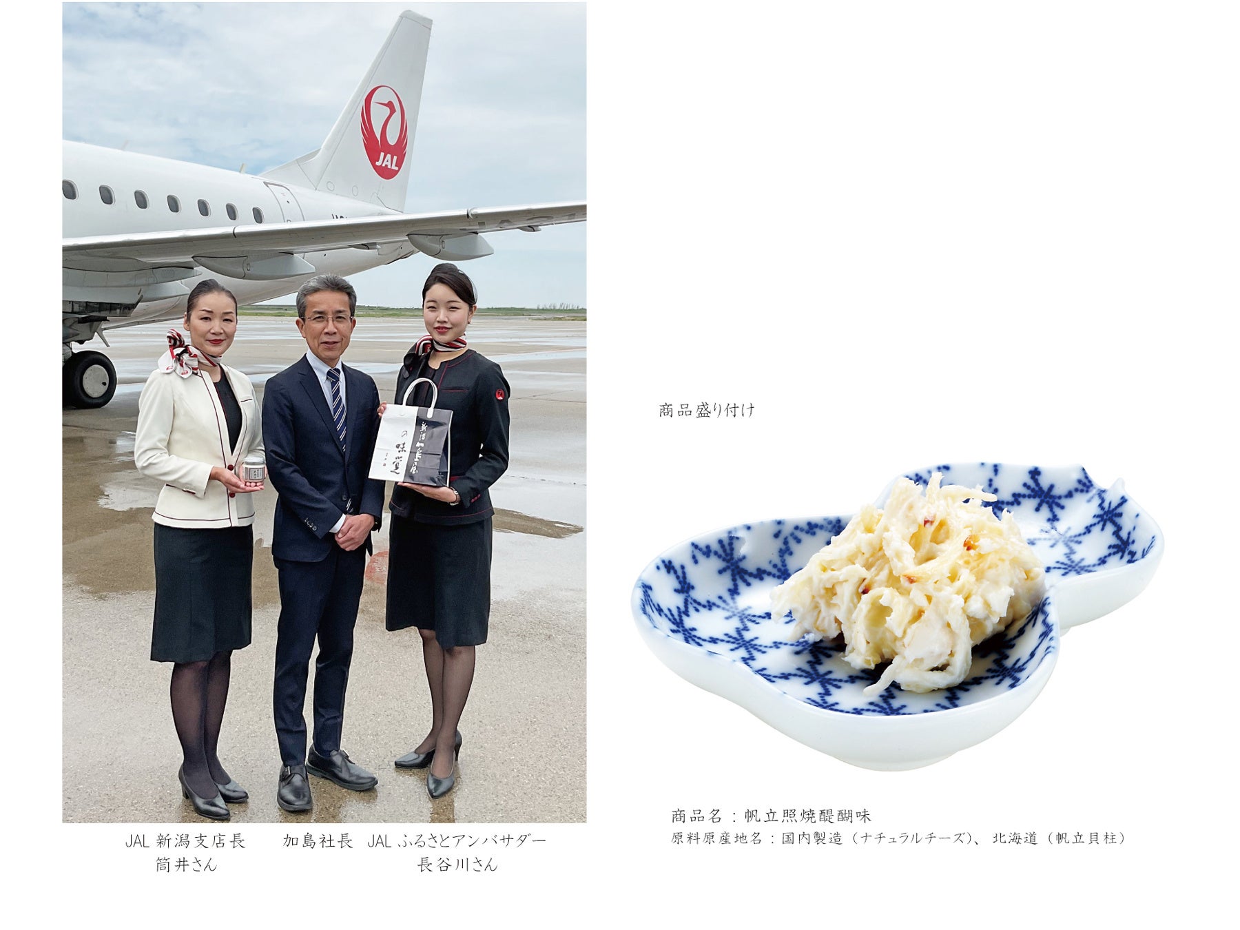 海産物加工・製造の株式会社加島屋(所在地:新潟市中央区、代表取締役:加島長八)が製造・販売している「帆立照焼醍醐味(ほたててりやきだいごあじ)」が日本航空(JAL) 国際線JALファーストクラス機内食に採用されました。
