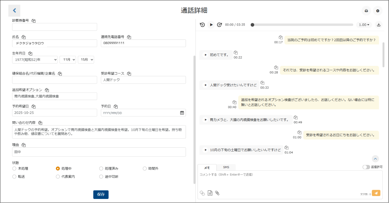 今回の健診予約シナリオでは、AIが一次受けで自然な発話で会話を開始。受診券番号・保険者・補助・オプション・注意事項を対話でヒアリング→整理→要約し、担当者への引き継ぎを自動化します。前日案内はSMS(ショートメール)で送信し、確実な受診をサポートすることもできます。聞き取り業務はAI電話が対応し、判断が必要な業務は人間が対応するという分業によって、枠稼働の安定化と機会損失の縮小にもつながります。