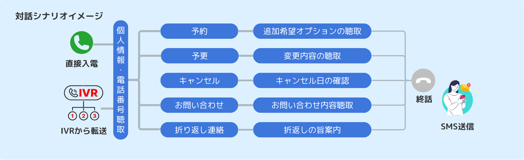 当社のAI電話は24時間365日×同時多回線で一次受けを行い、必要情報の聞き取りと整理、お問い合わせの一次対応を担います。予約確定までの前工程(情報収集・確認・整理・枠候補提示)を自動化し、最終確定はスタッフが行います。