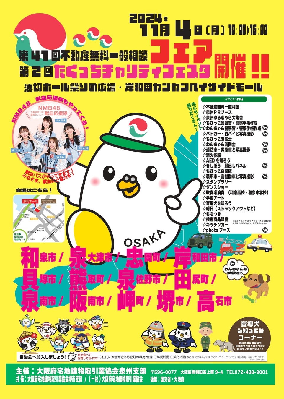 一般社団法人大阪府宅地建物取引業協会(所在地:大阪市中央区、会長 山本 清孝(以下、大阪宅建と言います。))は、2024年11月4日(月・祝)に大型チャリティーイベント「たくっちチャリティフェスタ!」を浪切ホール祭りの広場・岸和田カンカンベイサイドモールにて開催します。