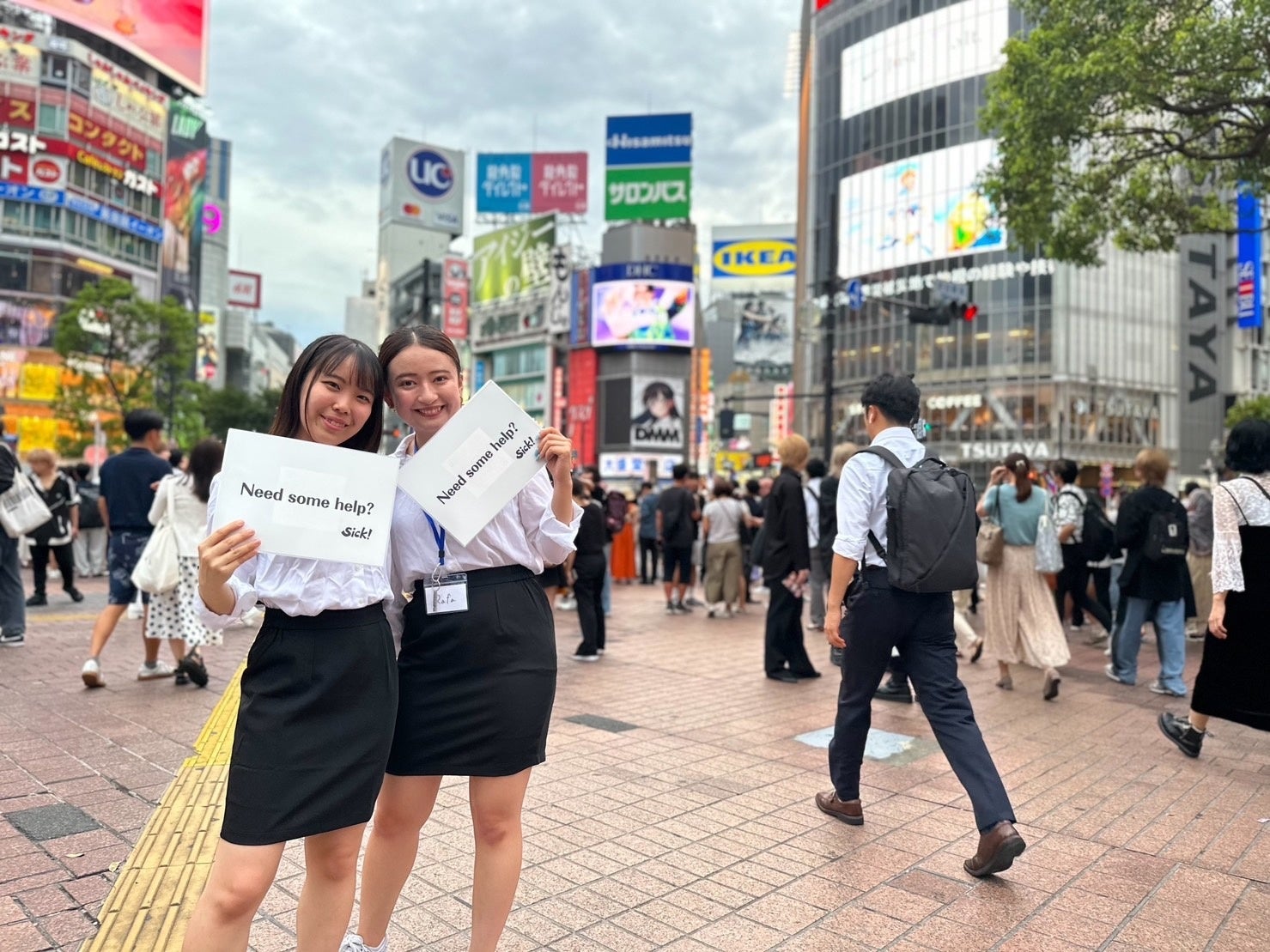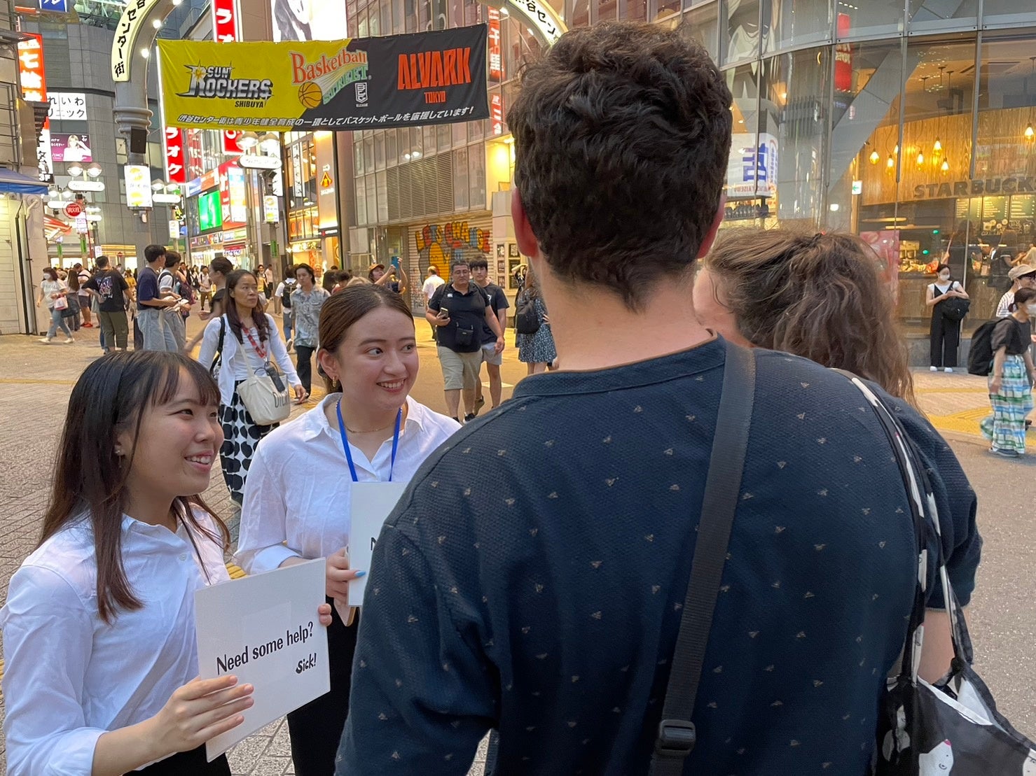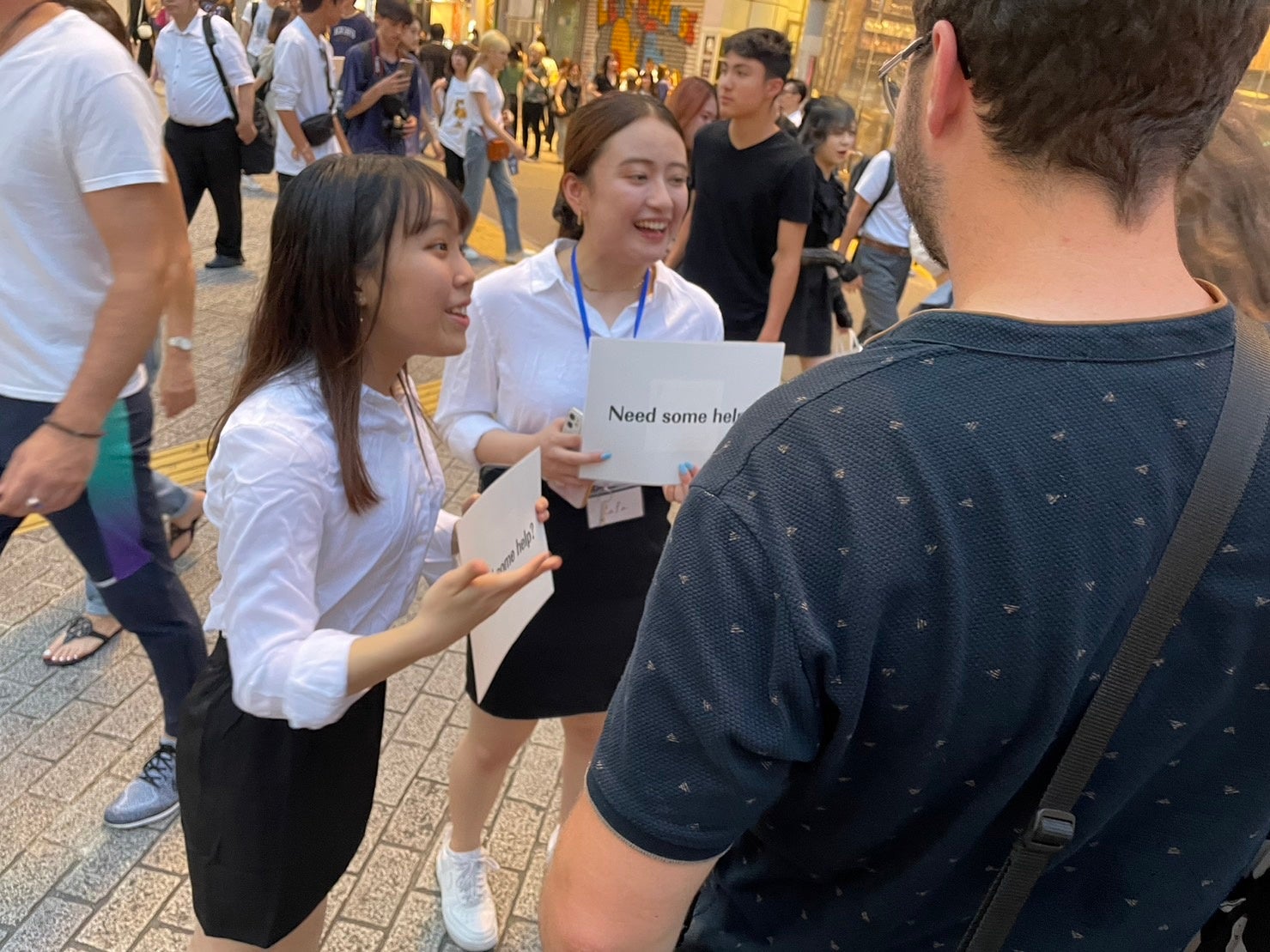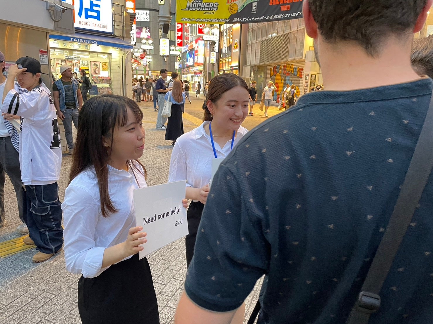 道案内はもちろん渋谷で日本語がわからないために困っている外国人観光客をお助けするキャンペーンで『おすすめの観光スポットはどこ?』など、通常店舗に来られたお客様との会話を渋谷駅近郊まで広げたサービスとなっております。