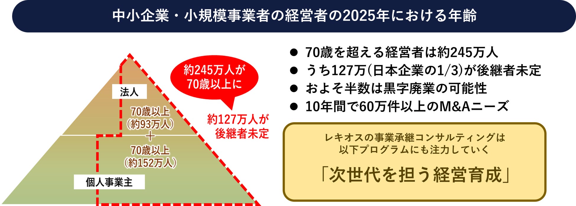 日本では2025年までに平均引退年齢の70歳を超える中小企業の経営者がおよそ245万人おり、そのうちの127万人程度に後継者がなく廃業の危機に直面しており、休業や廃業、解散した企業は年々増え、およそ半数は黒字だというデータもあります。優れた技術や製品をもっていながら、後継者がいないために会社を閉じるという事では日本にとっても大きな損失です。経営を次世代にバトンタッチしていくことが地域の活性化につながっていくはず。そこで、私たちは次世代を担う人材育成を見据え、「物事の本質」と「実践力」を身につけることを目的とした経営者育成プログラムを構築し、多様な分野の人材が主体的に社会問題の解決に取り組み、多くの仲間達とより良い社会を創造できるよう、事業継承コンサルティングに注力します。