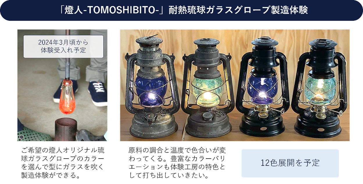 2024年1月に(2023年12月入居)、おきなわ工芸の杜(沖縄県豊見城市)にて、熱に弱く成形が難しい琉球ガラスをランタンに加工する技術の継承と担い手の育成を目的とした「耐熱琉球ガラス体験工房燈人-TOMOSHIBITO-」が晴れて開所し、展示即売会も開催されました。