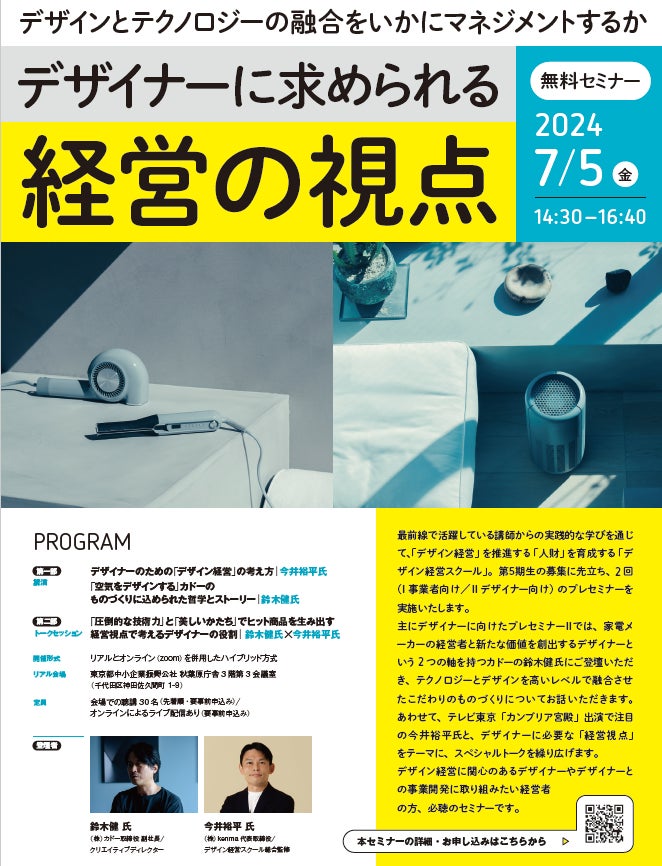 家電メーカーの経営者と、新たな価値を創出するデザイナーという2つの軸をもつカドーの鈴木健氏にご登壇いただき、スクールの総合監修を務めるkenma・今井裕平氏との対談を通じて、テクノロジーとデザインを高いレベルで融合させる″ものづくりへのこだわり”についてお話しいただきます。