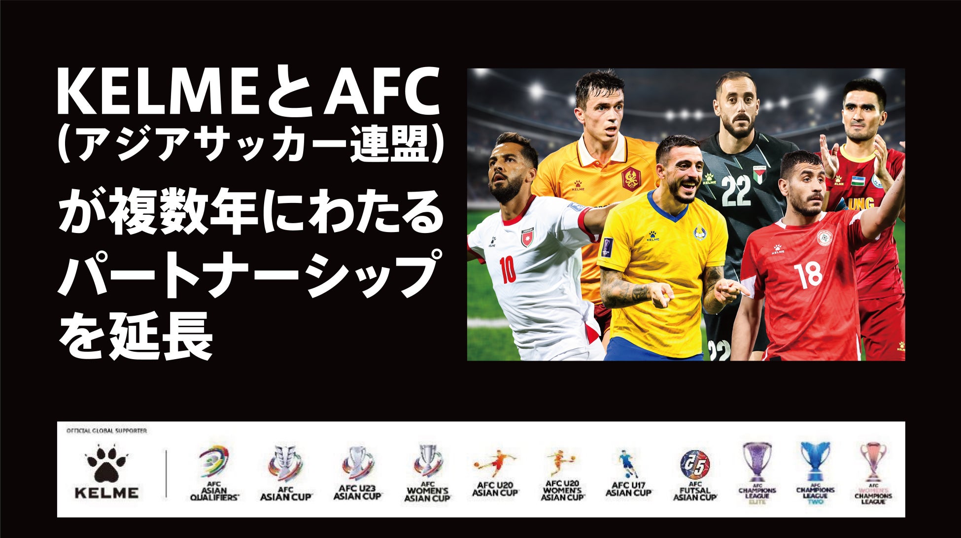 主な大会はAFCアジアカップサウジアラビア2027™、AFC女子アジアカップオーストラリア2026™、AFC U23アジアカップ™2026および2028、AFCフットサルアジアカップ™2026および2028、さらに2025年から2029年にかけて刷新されるAFCクラブ大会(AFCチャンピオンズリーグエリート™、AFC女子チャンピオンズリーグ™、AFCチャンピオンズリーグ2™)でKELMEが素晴らしいパフォーマンスを披露することを期待しています。