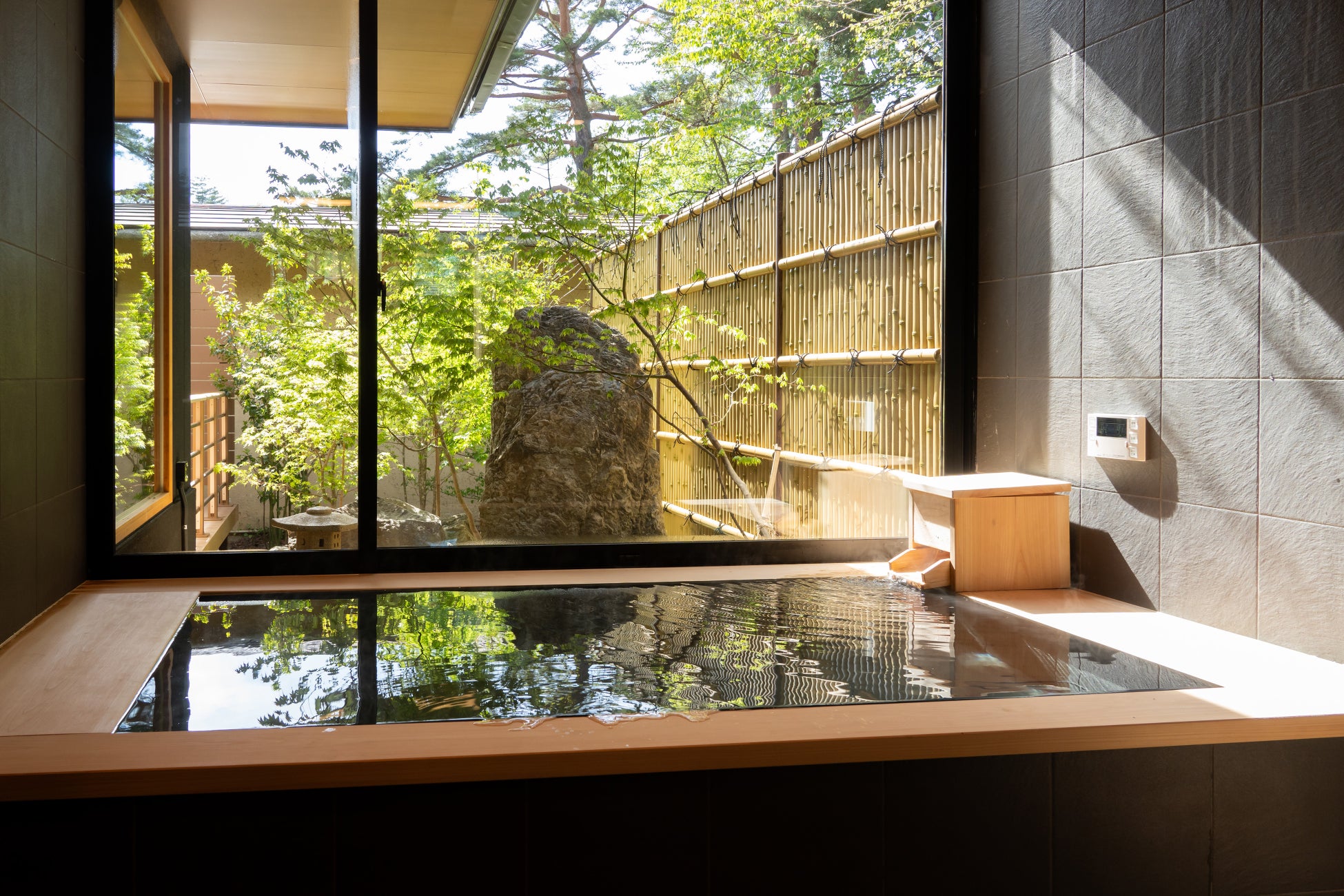 ・ 一枚板ガラスから見える庭を眺めながら浸かる「温泉半露天風呂(幅2.2mのゆったりサイズ)」