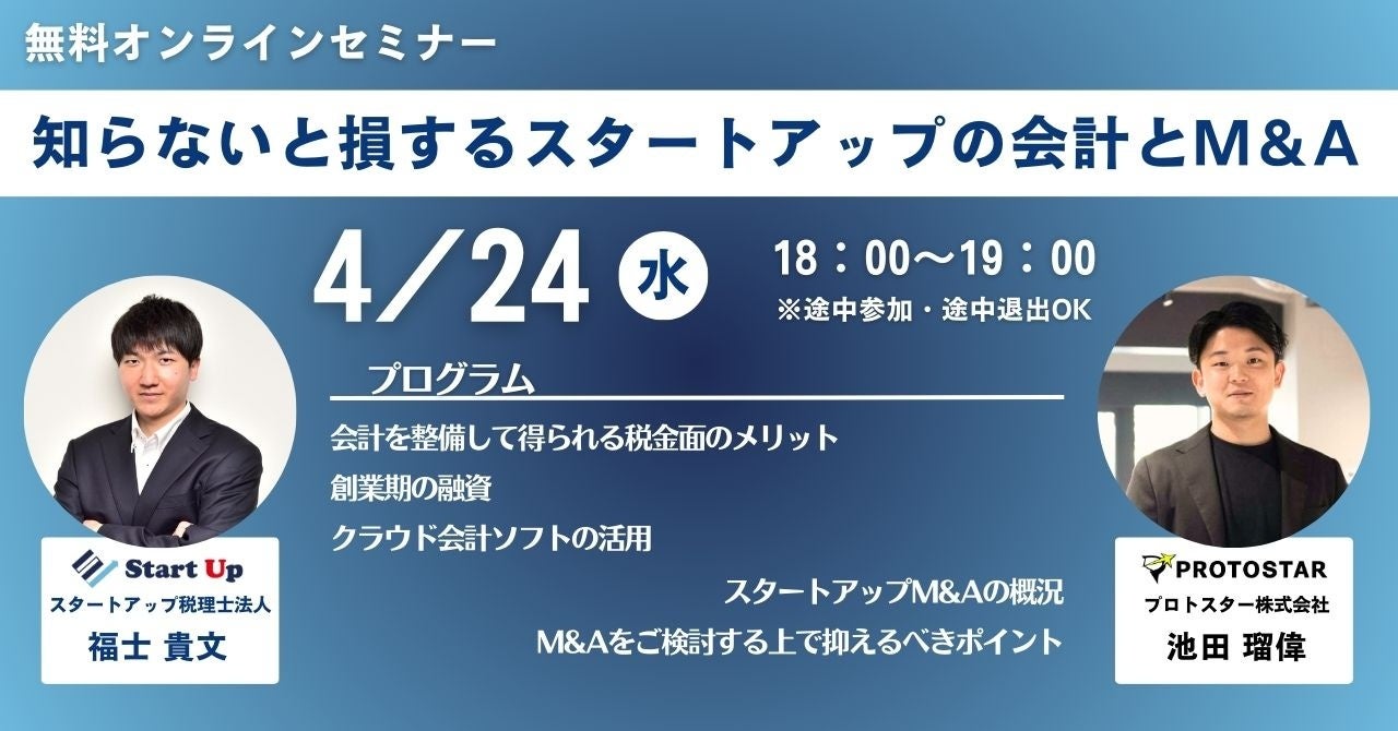 スタートアップ税理士法人(所在地:東京都新宿区、代表税理士:大堀 優)はプロトスター株式会社(本社:東京都中央区 代表取締役社長:前川英麿)とともに、無料オンラインセミナー『知らないと損するスタートアップの会計とM&A』を開催いたします。