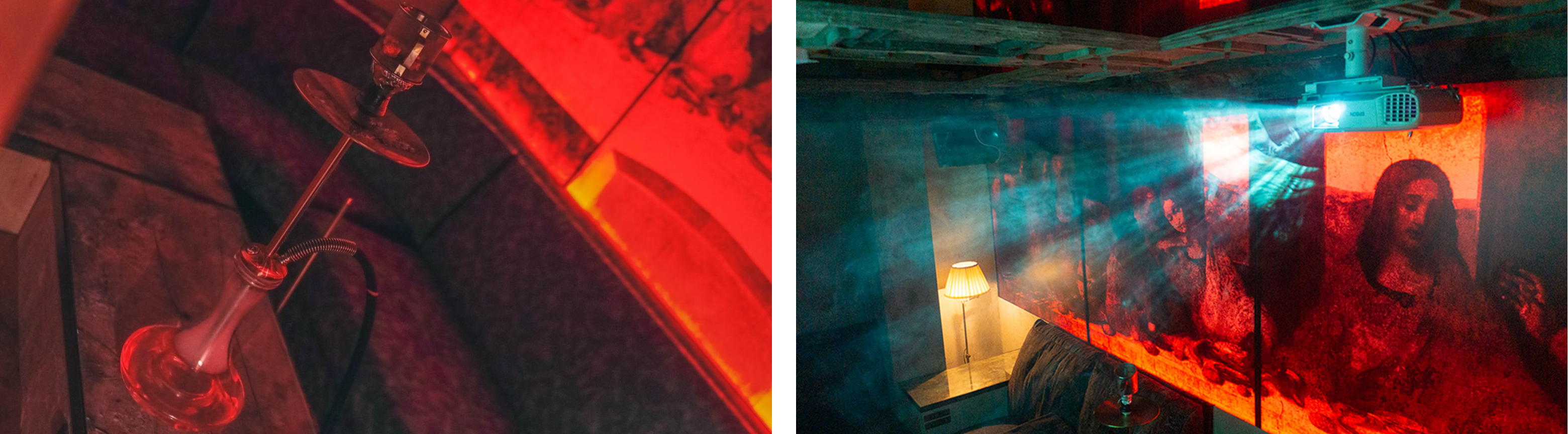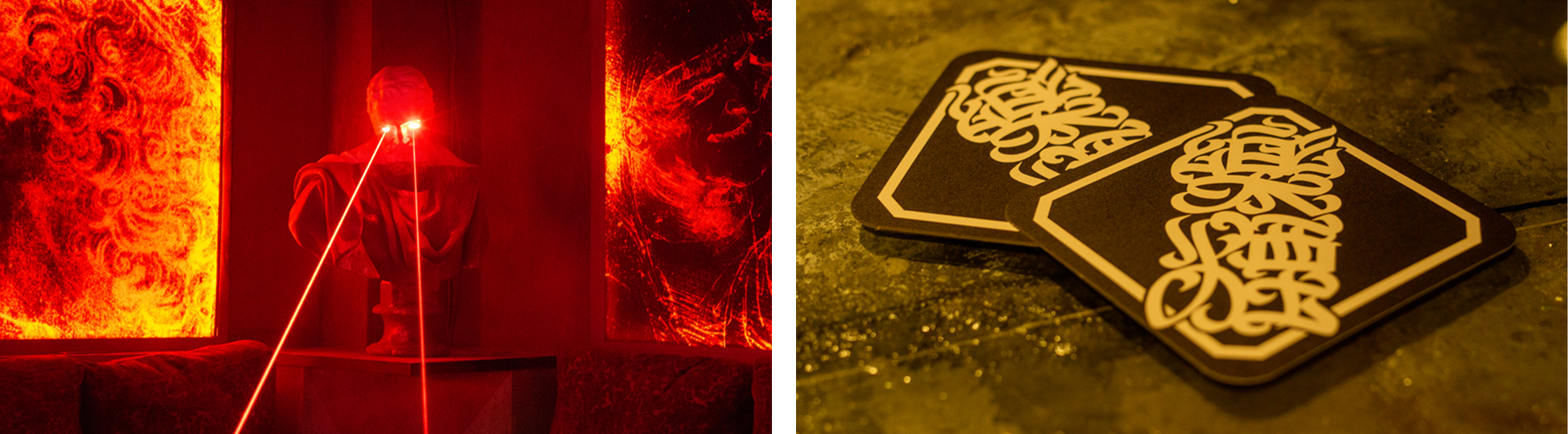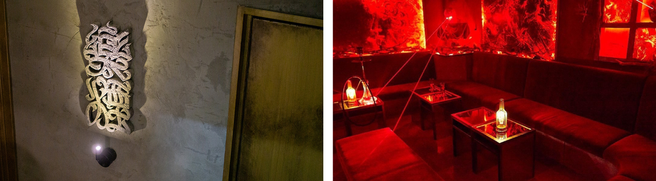 階段を登った先のエントランスには存在感のある大きな看板があり、ドアを開けばそこはまさに現代の樂園が広がっております。店内に散りばめられたアート、それらを引き立たせる光の束、煙と光による幻想的な空間演出は都会の喧騒とはかけ離れた時間を提供してくれます。